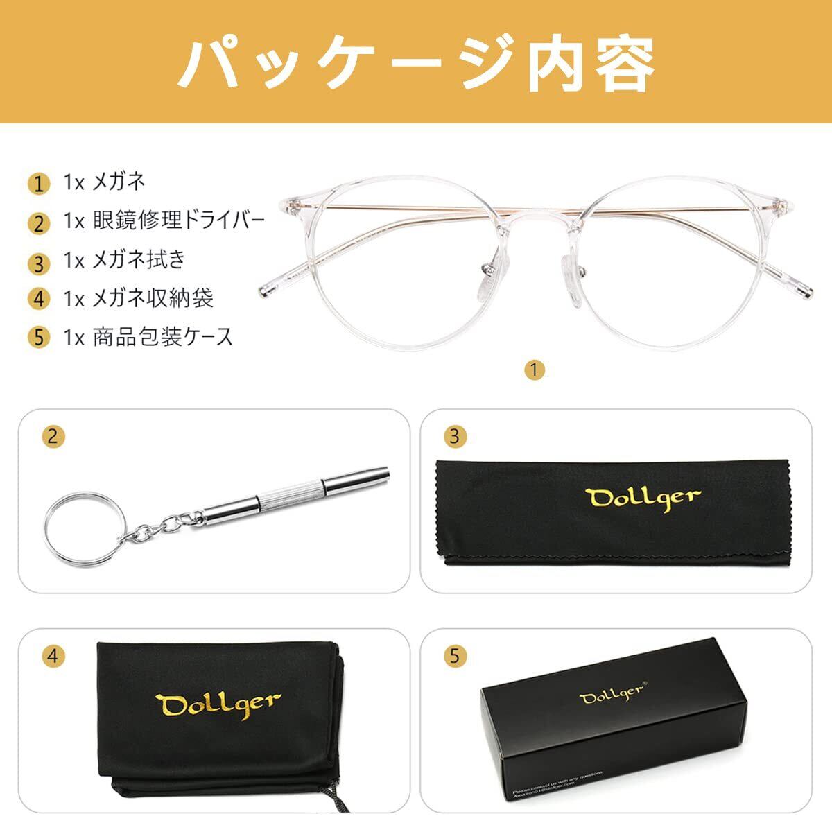 【ブルーライトカット・UV400保護】Dollgerのメガネは高品質のブルーライトカットの透明レンズを採用して、スマホ、パソコンやテレビなどのスクリーンからの目に有害なライトを遮断できます。UVカット率も99%に達成して、肌を老化させる原因と言われている紫外線をカットでき、紫外線防止対策になります。