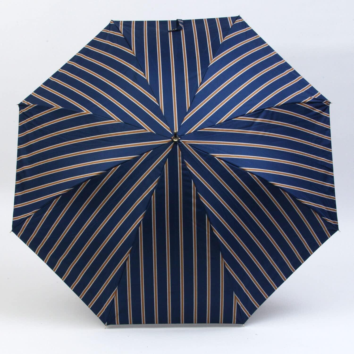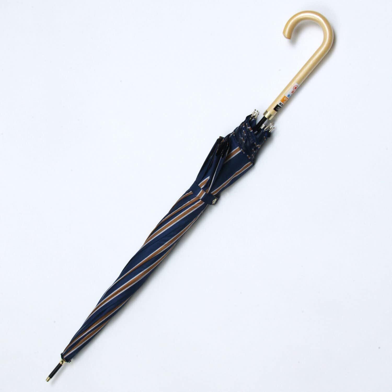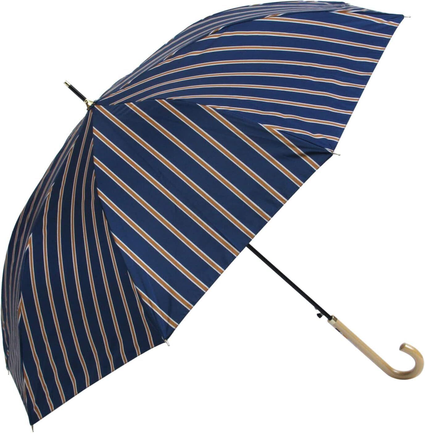 【在庫セール】ベーシックスタンダード 長傘 レディース 晴雨兼用 内側 日傘コーティング UV&遮光 99% 58cm ワンタッチ ジャンプ傘 丈夫 耐風 グラスファイバー骨 おしゃれ 木ハンドル かわいい ストライプ ネイビー