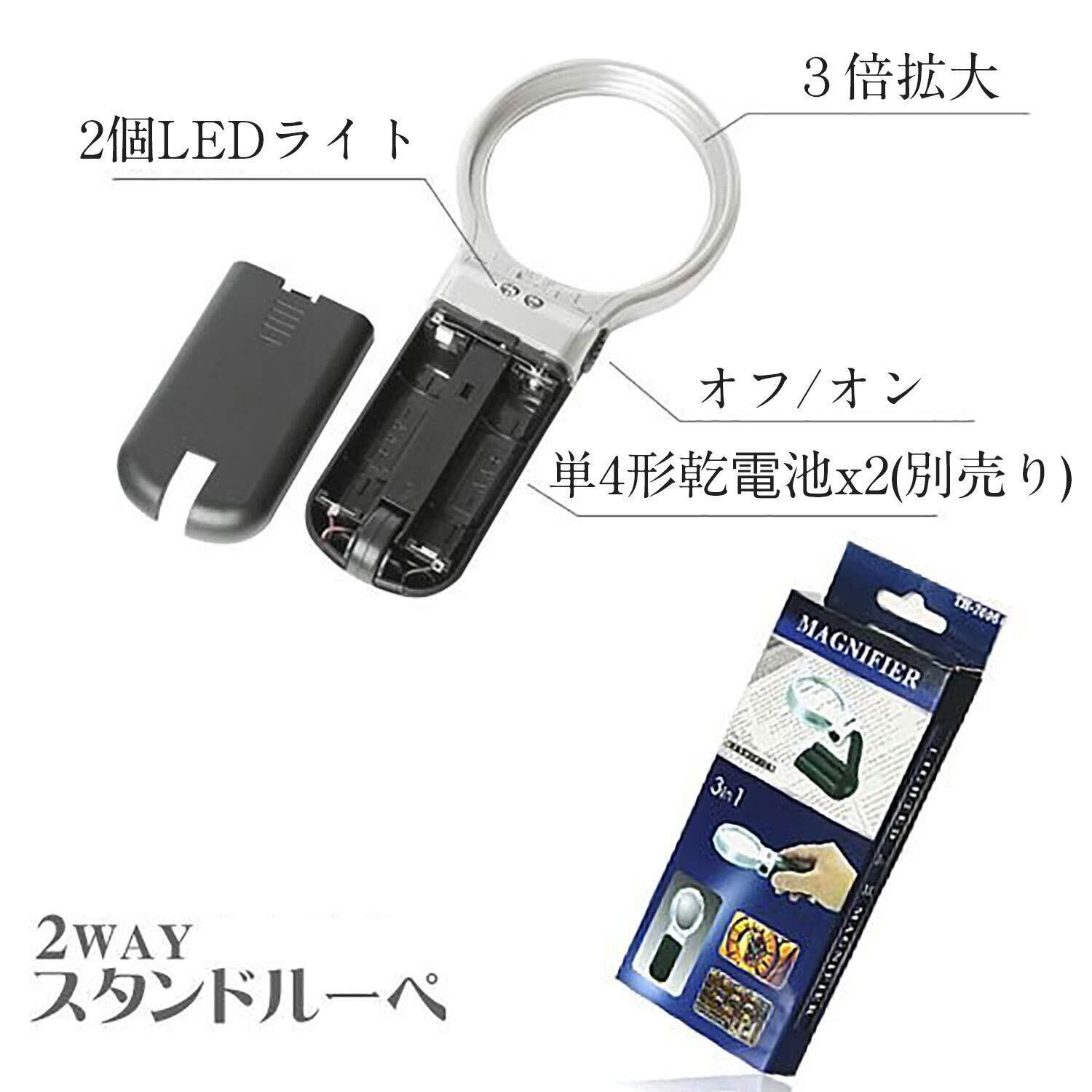 【仕様詳細】折り畳みサイズ:約16.3×7.4×2cm 展開サイズ:約12.5×7.4×8cm 直径:約63mm 重さ:約74g 素材:ABS樹脂・アクリルレンズ 拡大率:3倍 LED:2灯 電源:単3電池x2(別売り)
