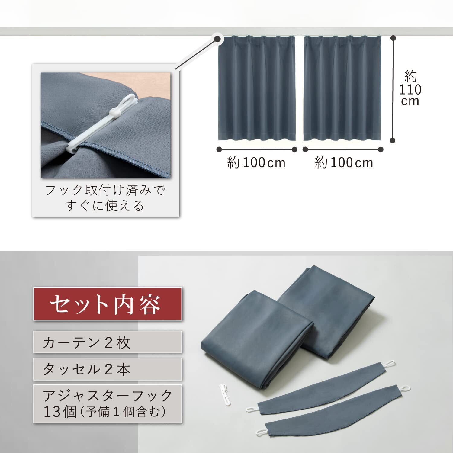 【商品仕様】:サイズ/約幅100×丈110cm、カラー/グレー、遮光率/99.99%以上(1級遮光)、内容/カーテン2枚・タッセル2本・アジャスターフック13個(予備1個含む)、材質/ポリエステル100%