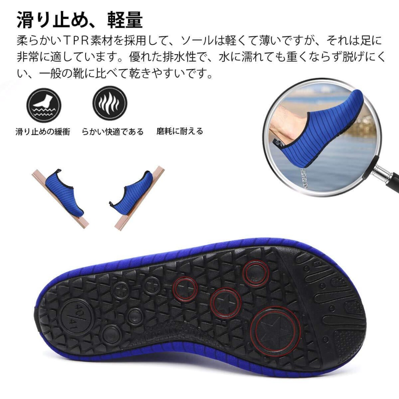 優れた伸縮性と排水性と通気性があり、柔軟性抜群。ゴム底で滑らず、水辺のケガから守る。靴底はゴムで滑りにくく、柔らかなはき心地。また、ソックスのような柔軟性で、履いても素足みたいな履き心地。