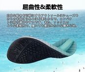 【裏地】ポリエステル+スパンデックス。そのため、吸湿性や速乾性が良い、足の爽やかさを保てます。シューズにはネオプレンを采用しているため、伸縮性と通気性に優れ、快適な履き心地となっている。マリンシューズ360度自由自在に曲がることができ、靴下のように丸めてコンパクトに保存できる。
