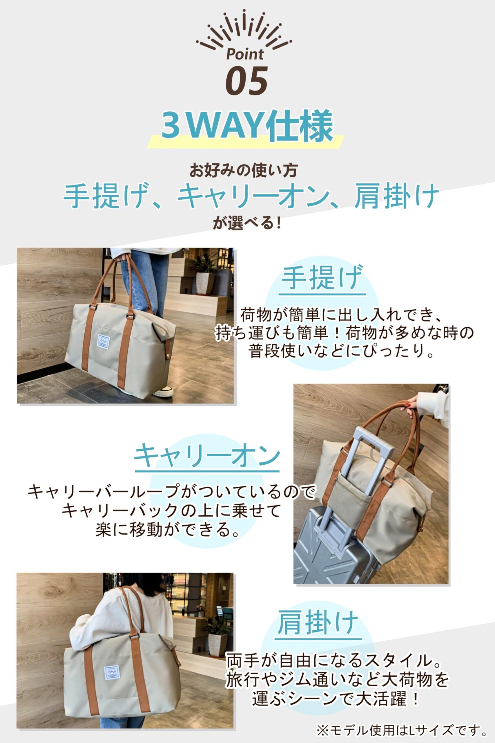 【スーツケースに取り付けられる】キャリーバーループが付いているので、スーツケースに乗せて運ぶことができます。小さく折りたためるので、スーツケースの中に入れて置き、旅行時に急に荷物が増えてお困りの際にサッと使えるので便利です。旅行カバンとして便利なボストンキャリーです。