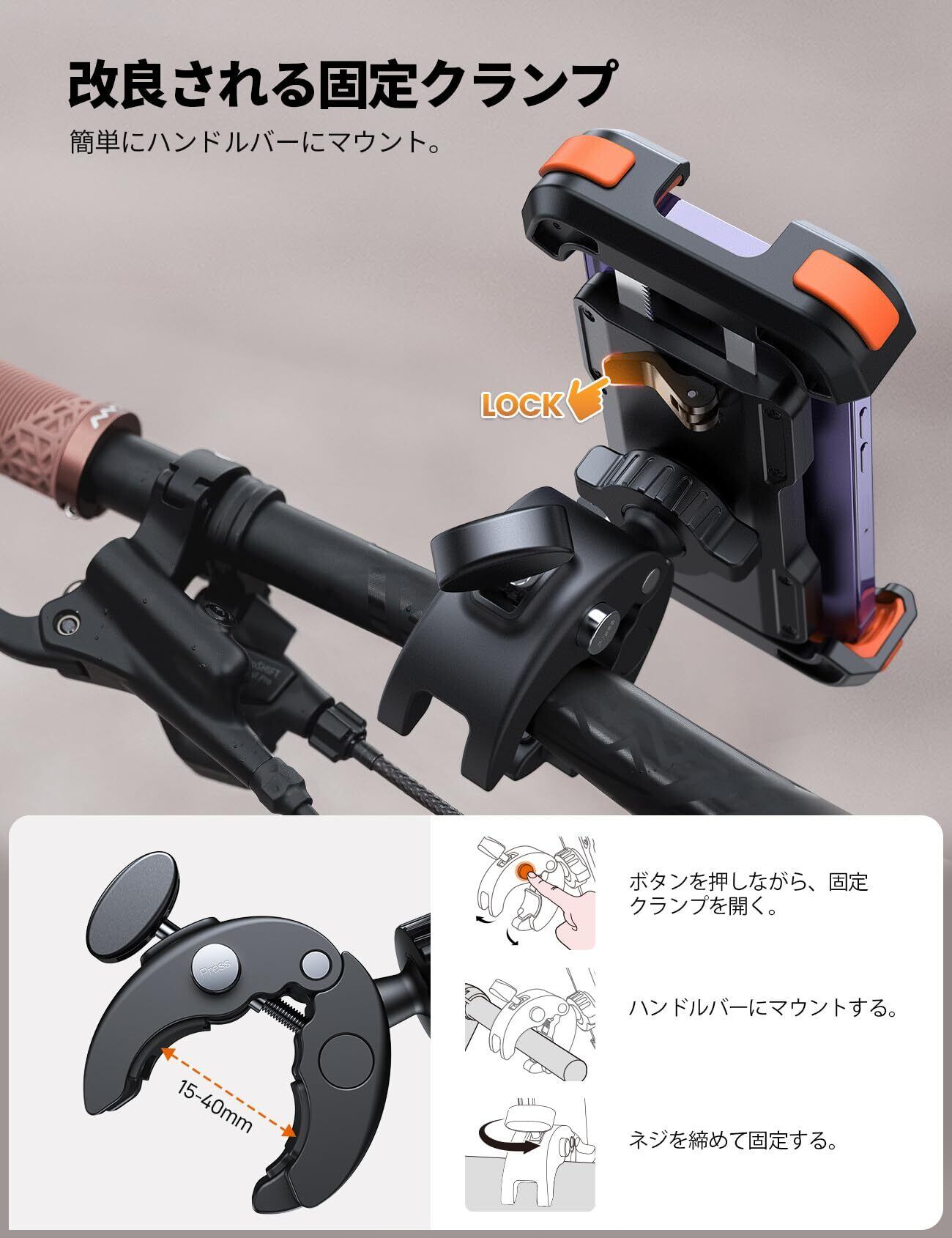 【操作簡単の固定クランプ】バイクスマホホルダーはネジタイプの固定クランプに取り付けボタンが設置され、工具不要で取り付けるだけでなく、普通ネジタイプ固定クランプよりも速く取り付けることができます。すまほホルダーはハンドル径の対応が幅広いで、15-40mmハンドル径に対応でき、市販されているハンドルバー、延長バーはほとんど合わせます。