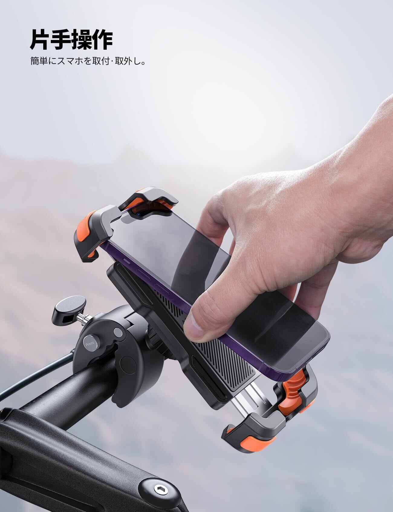 【片手着脱可能】原付スマホホルダーは丈夫で連動型のアームにより、片手でスマホを取付け・取外します。スマホでホルダーの上部/下部をプッシュしてスマホを入れ、手を離せると、アームは自動的に収縮し、ガッチリとご端末をクランプします。すぐに取り外しができるのでサイクリング中の撮影に便利。