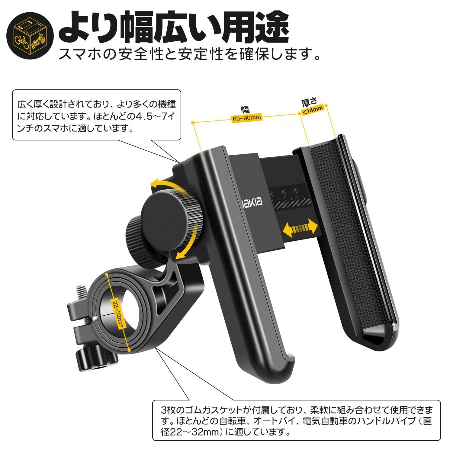 【衝撃低減シリコン、端末をしっかり守る】ホルダーの内側に網状のシリコンパッドが付き、衝撃による騒音を吸収するはもちろん、走行中に端末とホルダー間の摩擦により傷なども防止できます。ホルダーに三つのブレ防止シリコンが付き(ハンドルのサイズに合わせて1本または複数本を使用することを決めてください。任意にカットしてもいい) 。Tiakiaスマホホルダーーはハンドル径が22-32mmの自転車・オートバイに適用します。