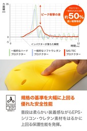 【仕様3】他のプロテクター素材で使用されるEPS、シリコン、ウレタンを上回る抗衝撃性があるから、衝撃を受けた際の性能劣化がありません。通常使用であれば10年の長期使用が可能です。