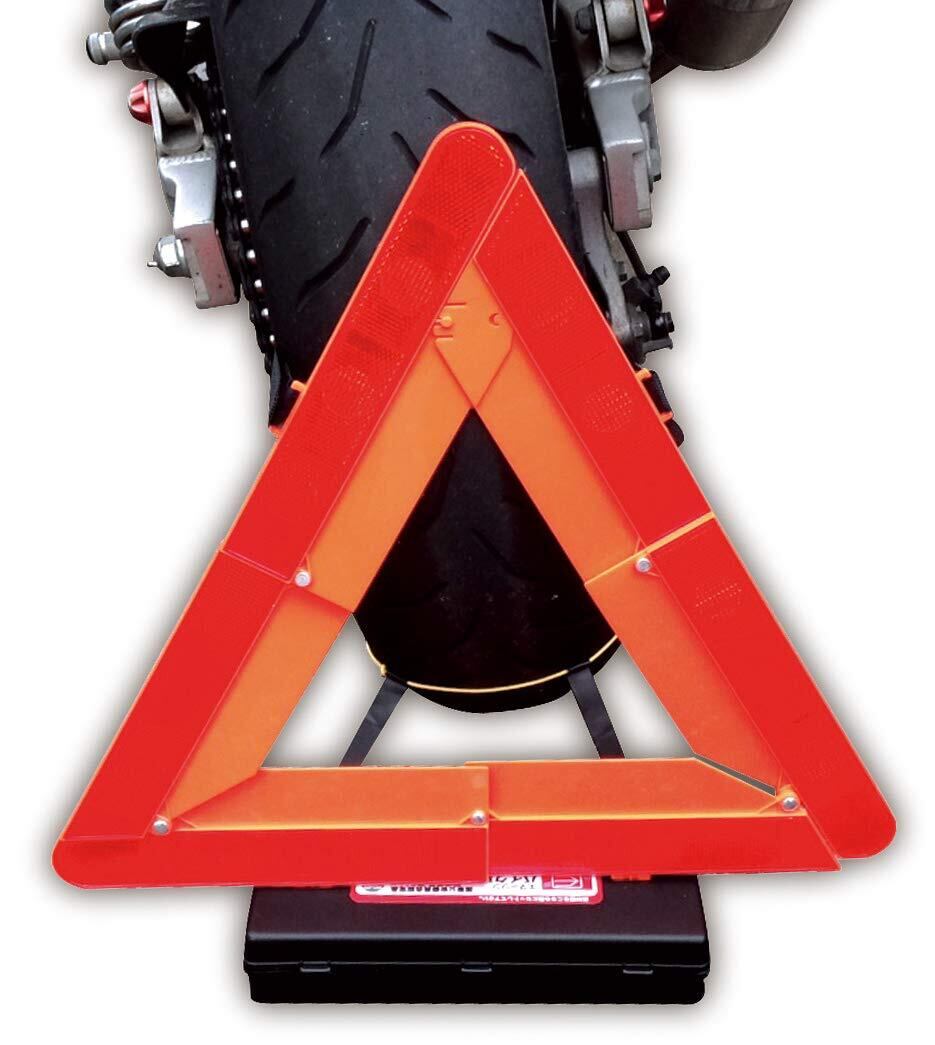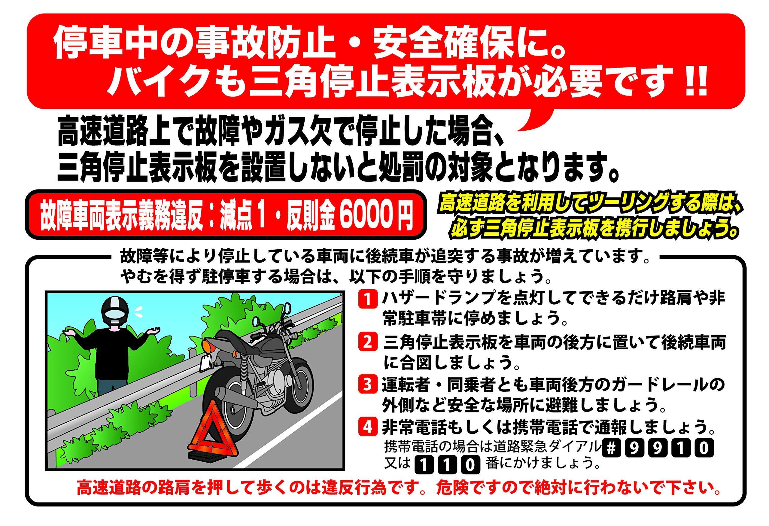 ●バイクの非常事態に備えて安心の三角停止表示板! 高速道路や自動車専用道路等でバイクを停止せざるを得ない場合、三角停止表示板を表示していないと、道路交通法違反となります! 1台に1つ常備しておきましょう。※故障車両表示義務違反:減点1・反則金/普通自動車6,000円