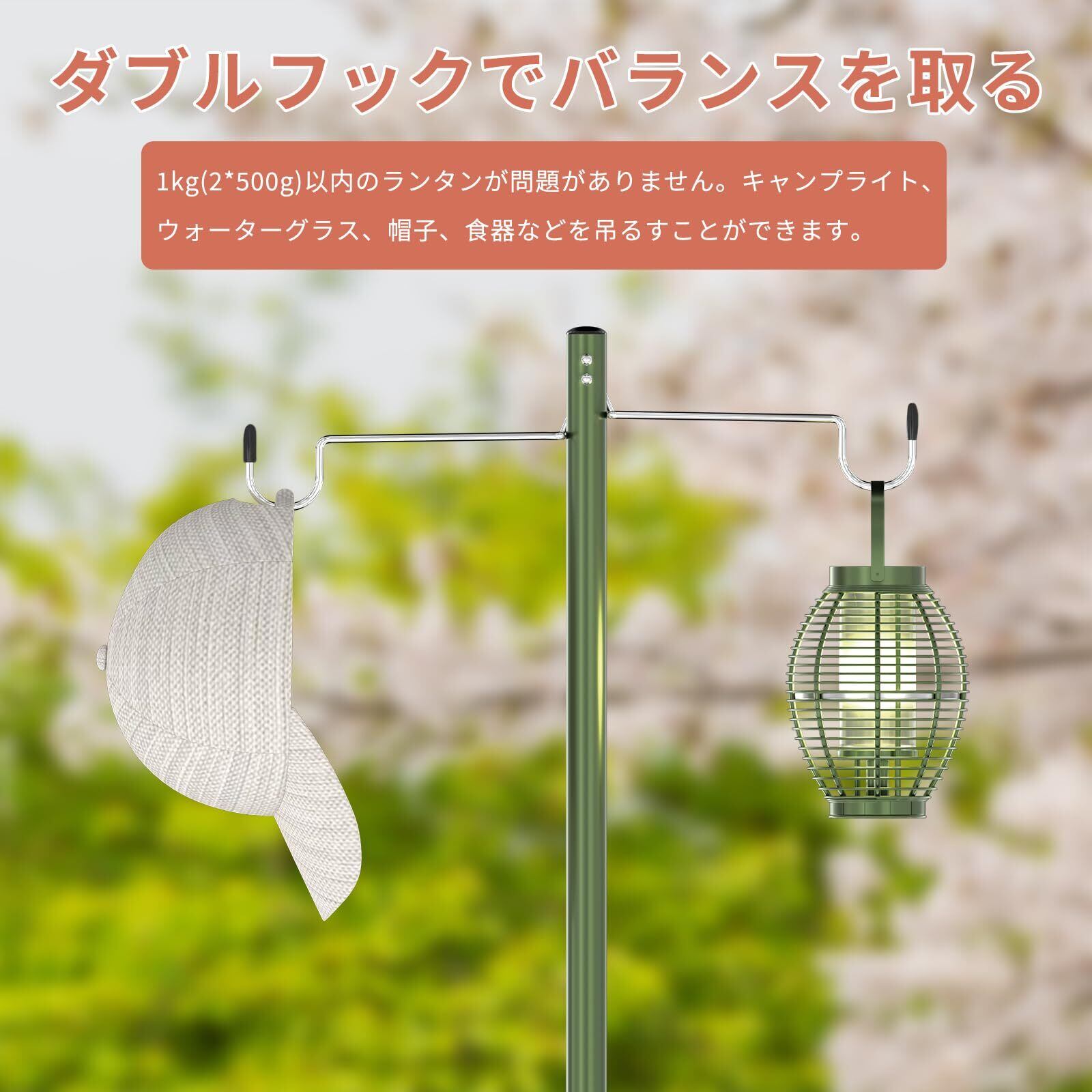 【高さ調節可能&ダブルフック設計】ランタンポールの長さは4段階に調節でき、約32cm、65cm、93cm、125cmの高さに設置することができます。卓上に置く場合は、高さを低く設定することもできます。「注目点」:ランタンフックが2つ付属し、最大耐荷重は約1kg(2*500g)です。ポールが重さでしなる場合は、ランタンハンガーの長さを短く調節してみてください。ペグを使用する場合は、地面にしっかりと固定されていることを確認してください。