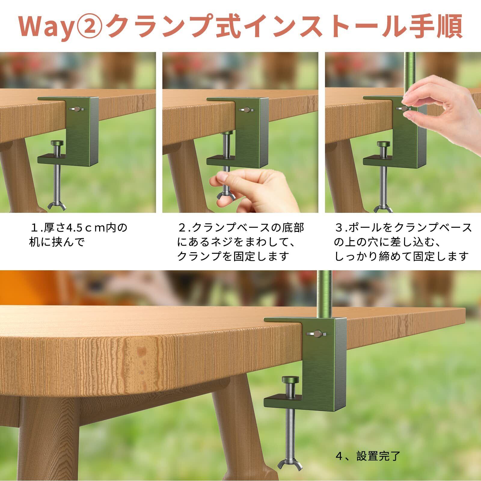 【2WAYペグ&卓上式-簡単に組み立て可能】ランタンスタンドは地面に刺し込んだり、卓上に設置することができます。ペグを使えば、お好きな場所に取り付け可能です。卓上に設置する場合は、付属のクランプを使えば、スペースを節約することができます。高い位置から360度の光を得ることができ、美しい雰囲気を演出できます。