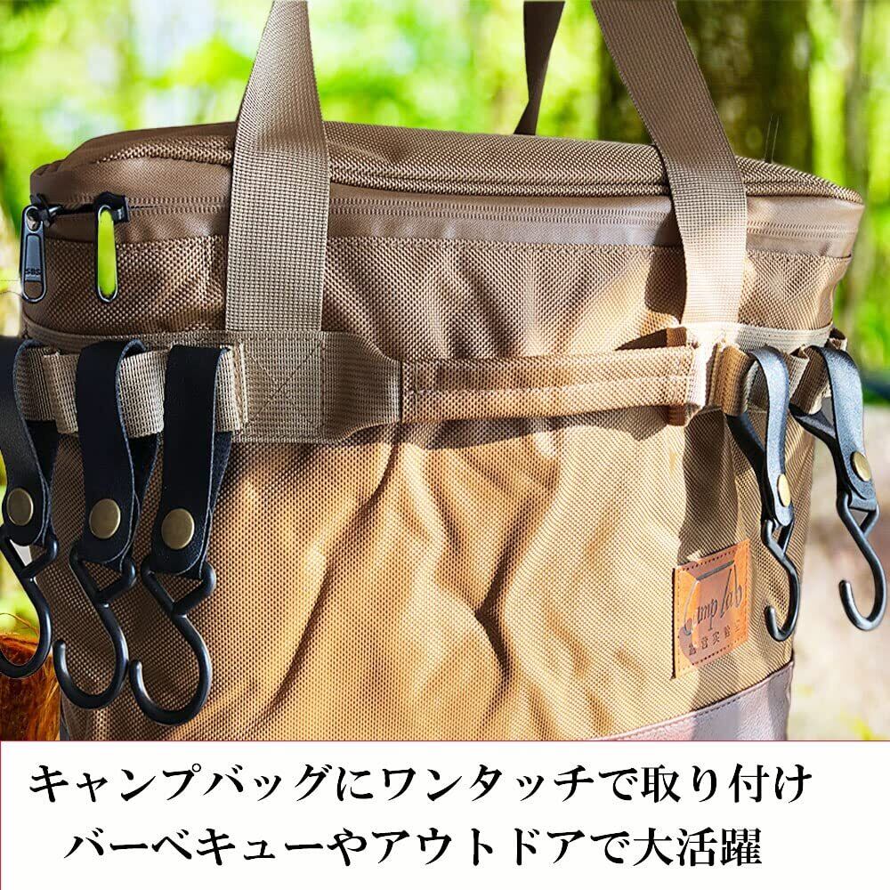 キャンプバッグやトートバッグに取り付けると、より多くのアイテムが運べます。スナップボタンでサッと取り付けられる折りたたみフックは様々なシーンで活躍します。