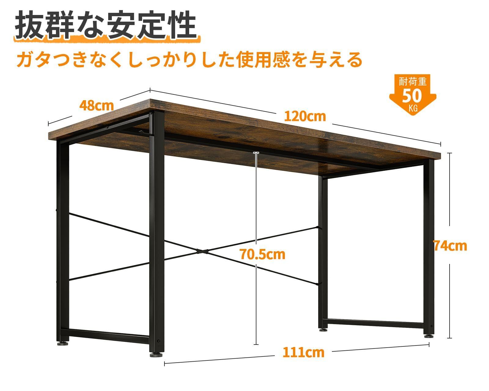 【商品仕様】シンプルでインテリアに馴染むおしゃれなデスクです。◆本体サイズ:幅120×奥行48×高さ74CM | 本体重量:9.3KG | 日本語組立説明書あり | お客様組立て品で、レンチも付属しており、別途で工具を買う必要がないです。