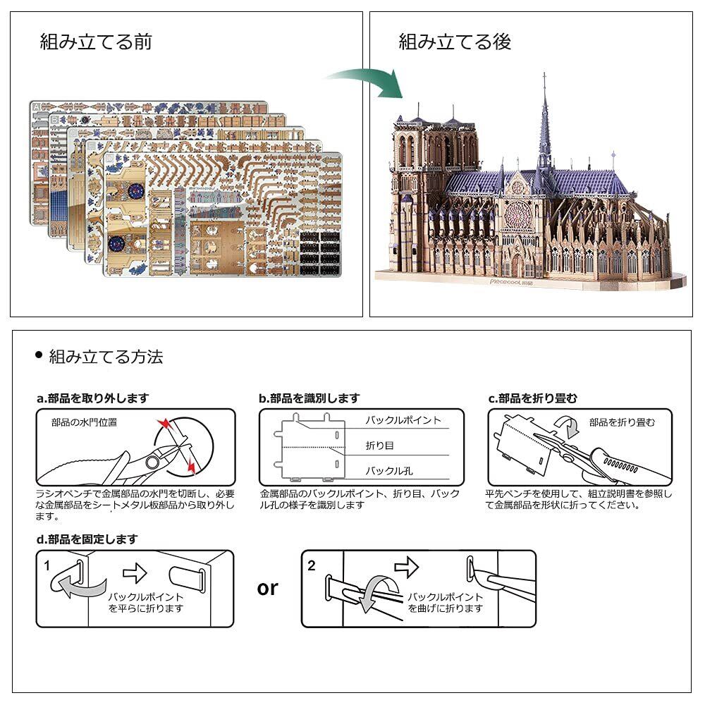 【在庫処分】Piececool (ピースクール) 立体パズル ノートルダム大聖堂 パリ有名建築 建物 3d立体パズル メタリックナノパズル 金属製 組み立て必要 接着剤不要 難易度5つ星 中級者 大人向け コレクション 置物