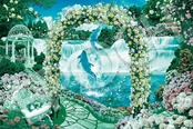 美しいローズガーデンでいきいきと飛び跳ねるイルカたちの様子を描いた作品です。