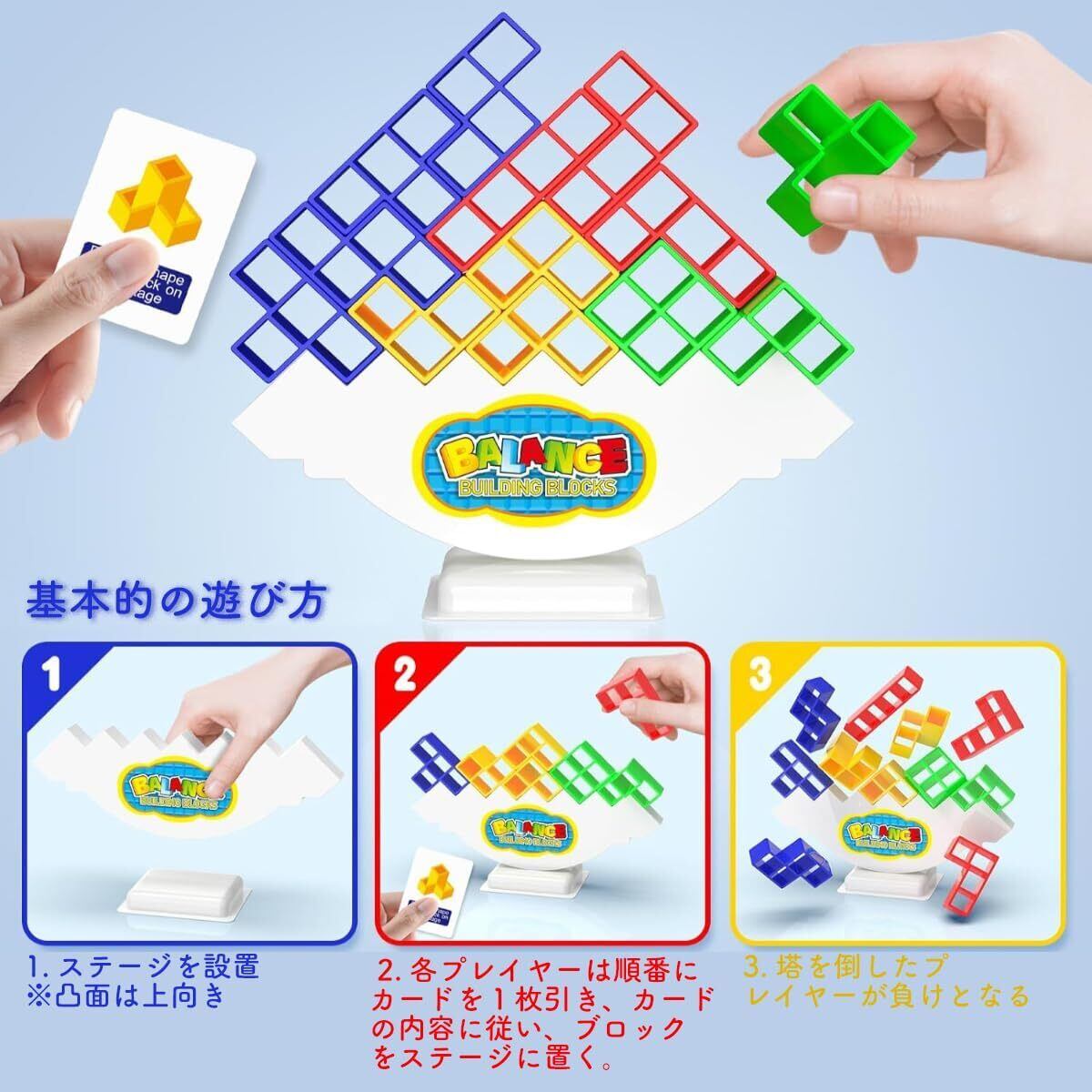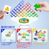 【遊び方】ステージを設置して、(1~複数人)順番を決め、カードの指示に従い、ステージにブロックを置きます。ブロックタワーを倒した人が負ける、バランスゲームとなります。さらに、ブロックは様々な形状があり、テトリスとして遊ぶのもよし、想像力を駆使してさまざまなパターンや建物を組み立てたりすることもできます。