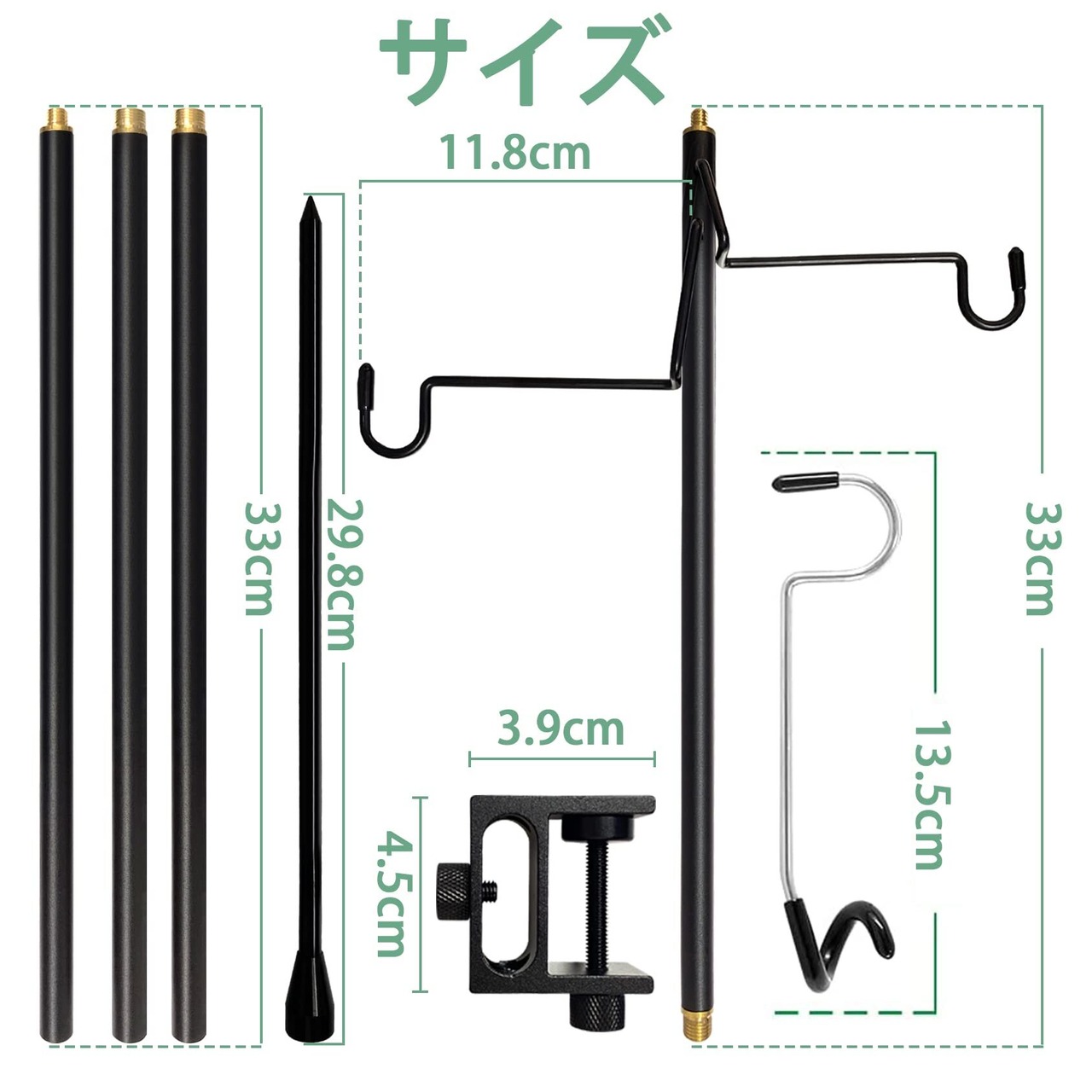 【仕様】材質:ランタンスタンド本体、長いペグ(1本)とグランプ(1個)は高強度アルミ製、ランタンハンガー(1個)とフック(2個搭載)はステンレス製、附属するフックは両端の末に滑り止めためゴムカバー付き、収納袋はナイロン製です。色:ブラック 高さ最大約156cm、直径12mm、重さ約378g(付属品含む)、耐重量1kg、 取り付け可能なテーブル厚さは3cm以内です。