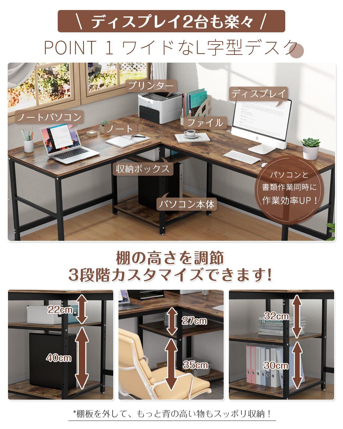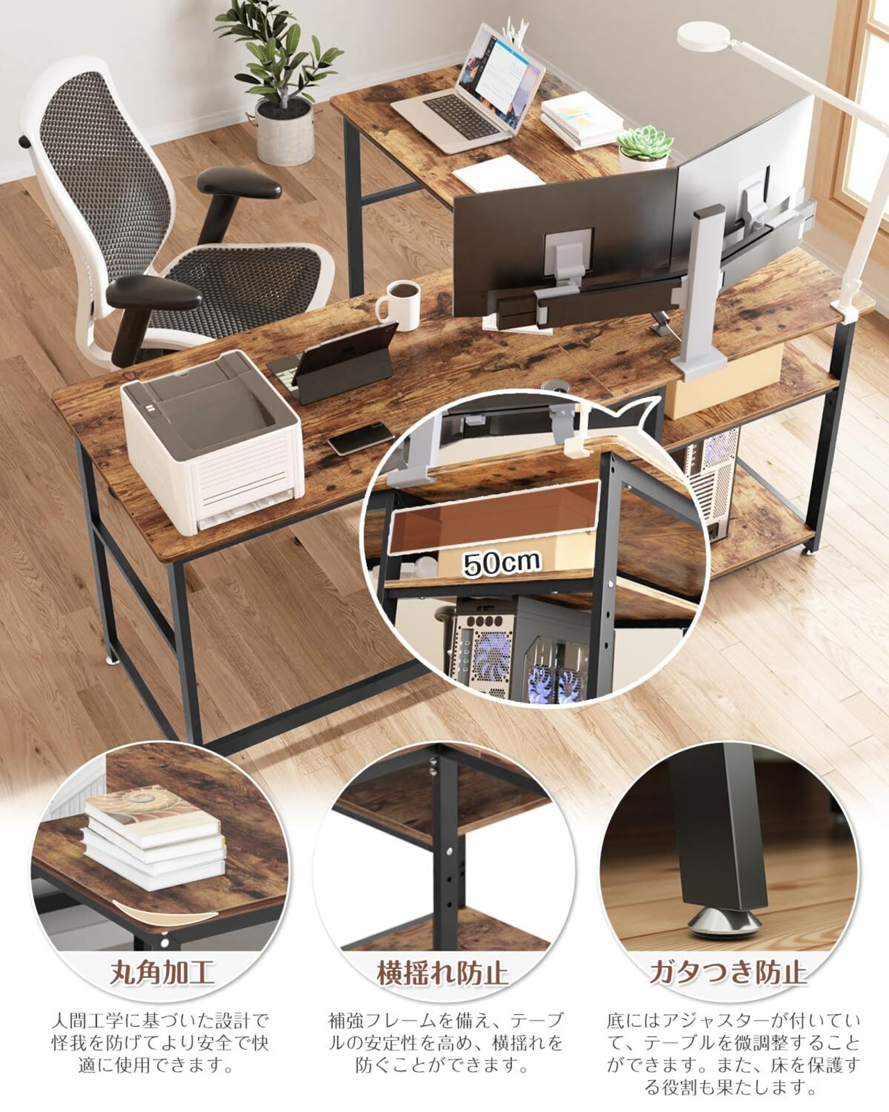 【2段ラック付&実用性】この L字型パソコンデスクの足元には2段収納棚が備え、棚板約5cmの間隔で調節でき、本や書類などを使いたい時にサッと取り出せますし、CPUなど背の高い物も収納できます。L字デスクは実用性が高く、超ワイドL字天板で、オフィスだけではなく、ゲーミングデスクとしても最高です。ゲームプレイ、在宅勤務、書斎机、勉強机など様々なシーンで大活躍!