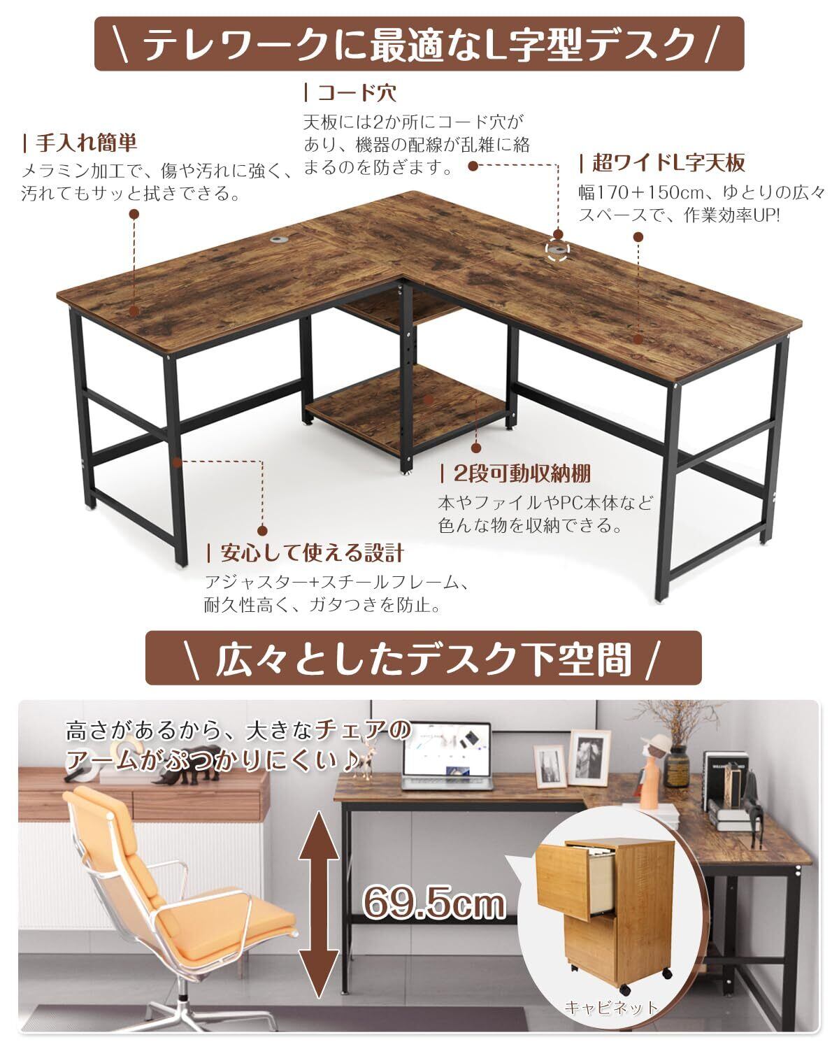 本製品は、幅170cmと150cmを持つl字型デザインで、デスク周りのスペースを最大限に活かします。奥行60cmのサイズは、パソコン、書類、さらにお気に入りのアイテムを配置するのに十分な広さで、スムーズな作業を実現します。