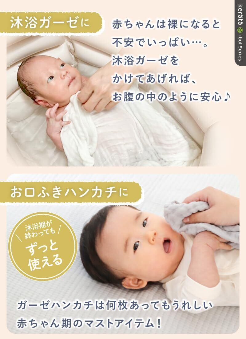 「この『(ケラッタ) イブル 沐浴ガーゼ ハンカチ・タオルセット』を使えば、赤ちゃんとの特別な時間をさらに快適に。優れたアイテムとして、ぜひご利用ください!」