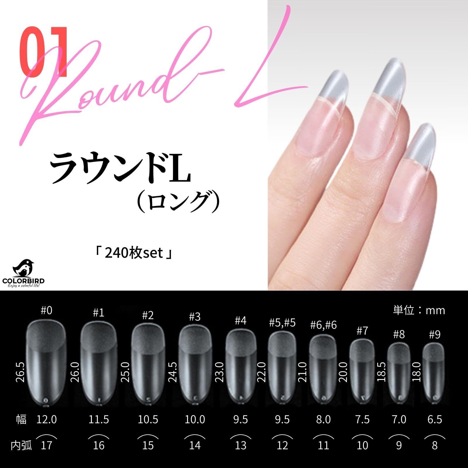 COLORBIRD ネイルチップ 超薄 ロング クリア サンディング 自然なフィット感 つけ爪 (ラウンドL, 240pcs)