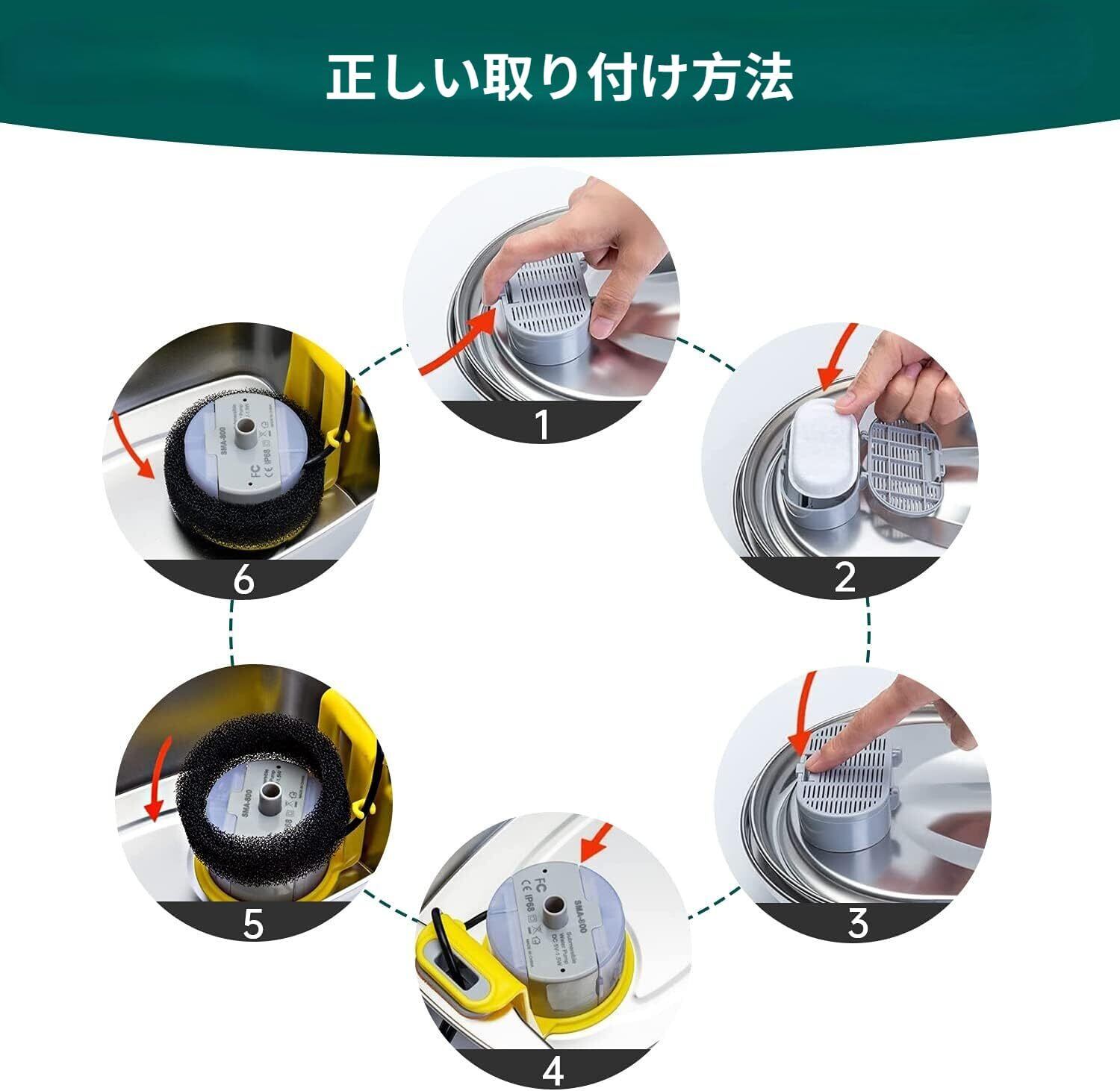 【注意】使用前に、水に浸して犬用浄水器フィルターを洗い流し、犬用浄水器の水を交換するたびにフィルターを洗浄し、3〜4週間ごとに猫犬用浄水器フィルターとスポンジを交換する。