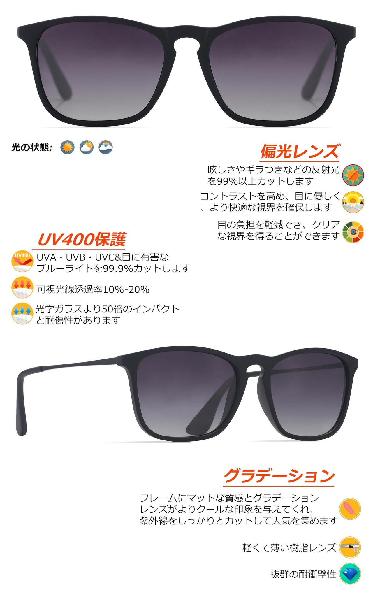 【UV400保護+偏光レンズ】UVA・UVB・UVC&目に有害なブルーライトを100%カットし、可視光線透過率10%-20%。光学ガラスより50倍のインパクトと耐傷性があります。偏光レンズ使用のため、眩しさやギラつきなどの反射光を99%以上カットします。コントラストを高め、目に優しく、より快適な視界を確保でき、目の負担を軽減し、クリアな視界を得ることができます。しかもポリカーボネート偏光レンズでより鮮やかな視界、軽くて薄い、抜群の耐衝撃性が実現できます。