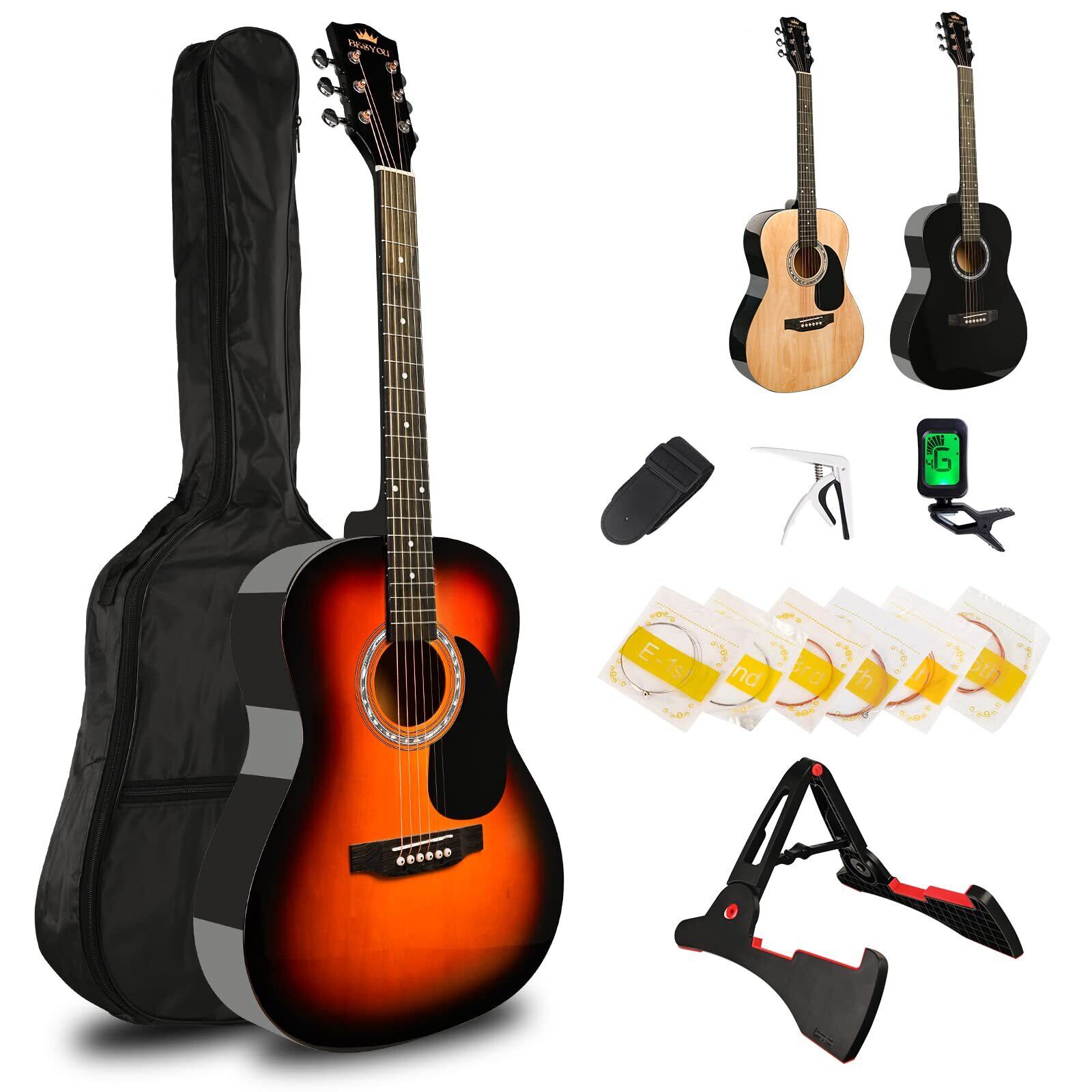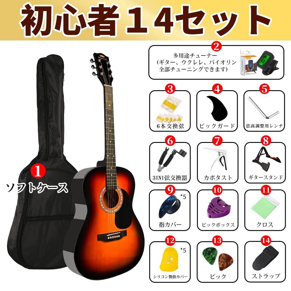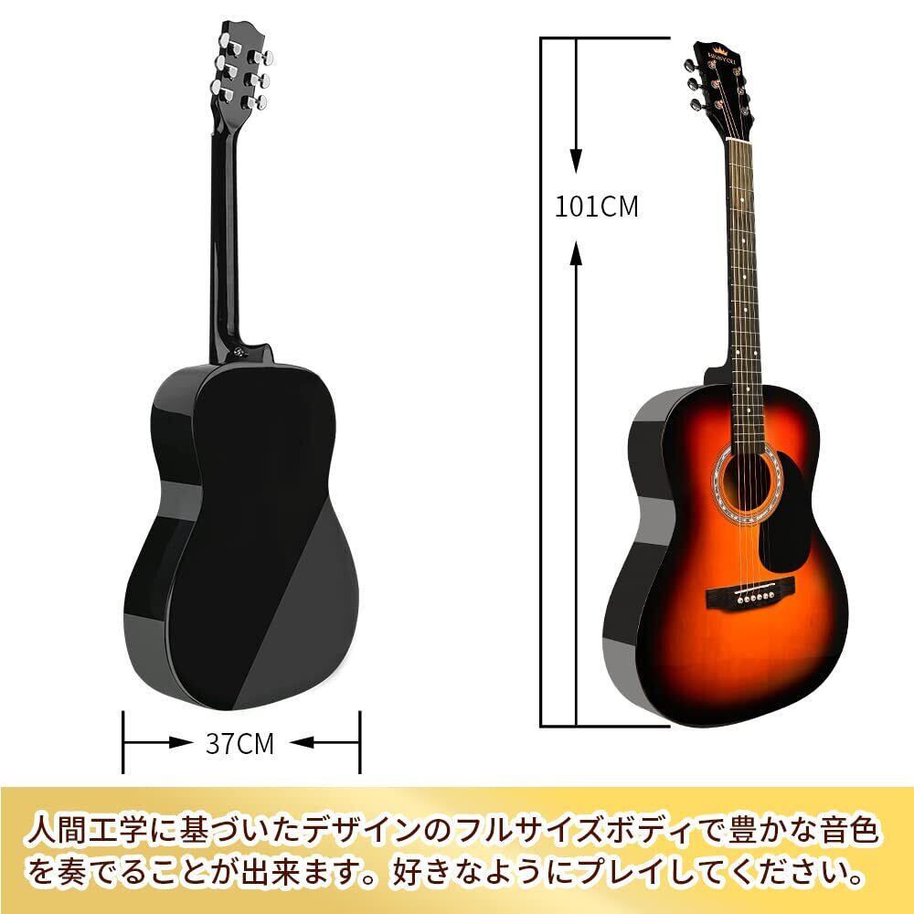 BESYOU アコースティックギター 初心者入門用セット 大人 学生用 39インチ アコギ 練習ギター 厳選バスウッド材 ギター サンバースト色 チューナー 付き クラシックギター