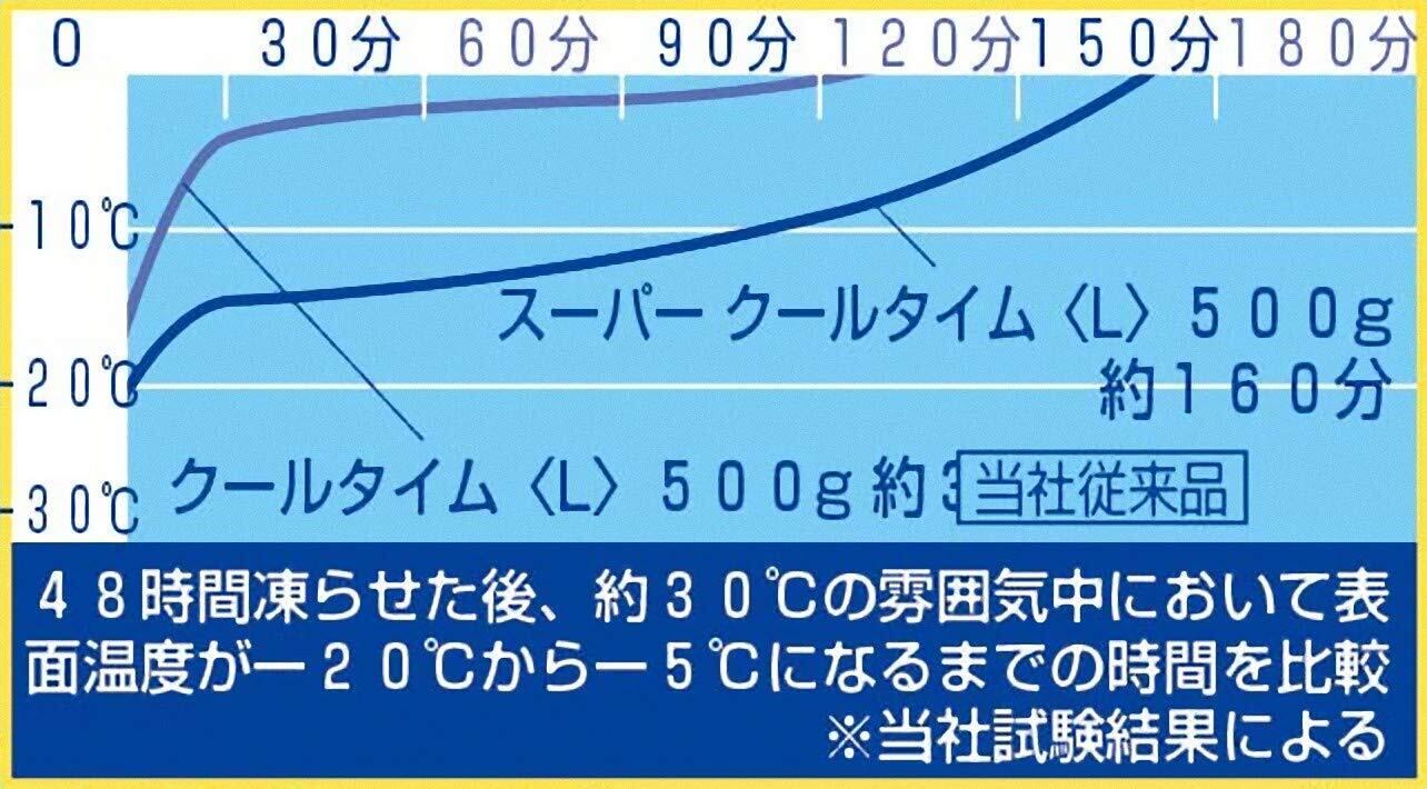 特徴:冷却効果約5倍(スーパークールタイム(L)500g約160分/クールタイム(L)500g約30分)※当社試験結果による