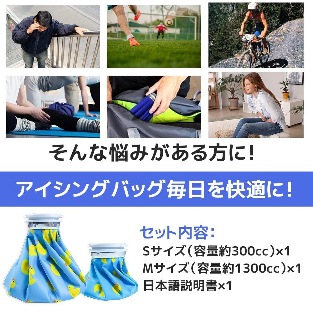 【セット内容物】Sサイズのアイスバッグ(容量約0.3リットル)×1、Mサイズのアイスバッグ(容量約1.3リットル)×1、日本語説明書×1 氷を入れると、室温との差が大きい場合、結露(生地が濡れたようになる現象)が生じる可能性があります。もちろん氷をたくさんある方が冷却時間が長くなりますが、相対的に結露する可能性も高くなります。室内室外の温度差が大きいときに使う場合は、水と氷の割合を1対1にすると良いとアドバイスしています(タオルなどで包んで使用することをおすすめします)。【温かいヒント】:氷嚢に少し塩を加えると、冷却時間が少し長くすることができます。商品写真はできる限り実物の色に近づけるよう徹底しておりますが、 お使いのモニター設定、お部屋の照明等により実際の商品と色味が異なる場合がございます。