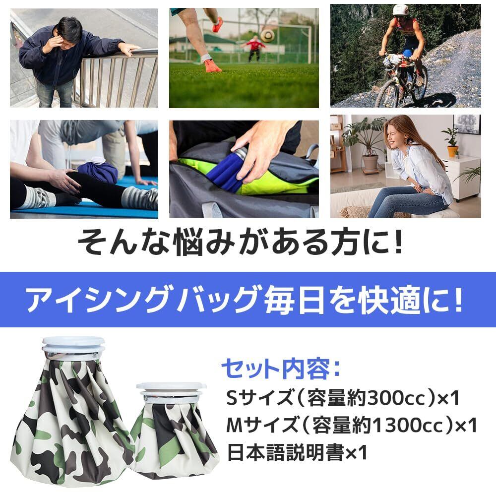 【セット内容物】Sサイズのアイスバッグ(容量約0.3リットル)×1、Mサイズのアイスバッグ(容量約1.3リットル)×1、日本語説明書×1 氷を入れると、室温との差が大きい場合、結露(生地が濡れたようになる現象)が生じる可能性があります。もちろん氷をたくさんある方が冷却時間が長くなりますが、相対的に結露する可能性も高くなります。室内室外の温度差が大きいときに使う場合は、水と氷の割合を1対1にすると良いとアドバイスしています(タオルなどで包んで使用することをおすすめします)。【温かいヒント】:氷嚢に少し塩を加えると、冷却時間が少し長くすることができます。