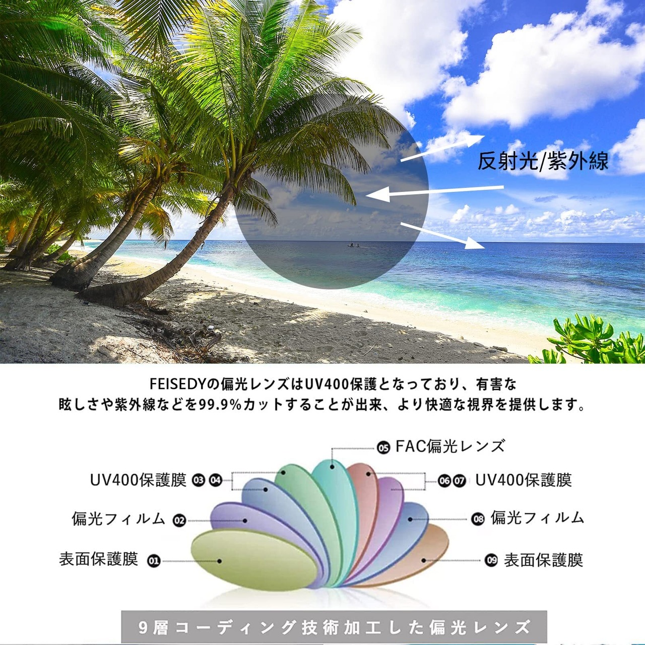 【HD 偏光レンズ】FEISEDY のHD 偏光レンズは、太陽から反射されたまぶしさなどの有害な光を効果的にフィルターし、目に有害な大部分な「青色光 (ブルーライト)」をカット! 紫外線99.9%カット! 長期的なダメージから目を守ります。