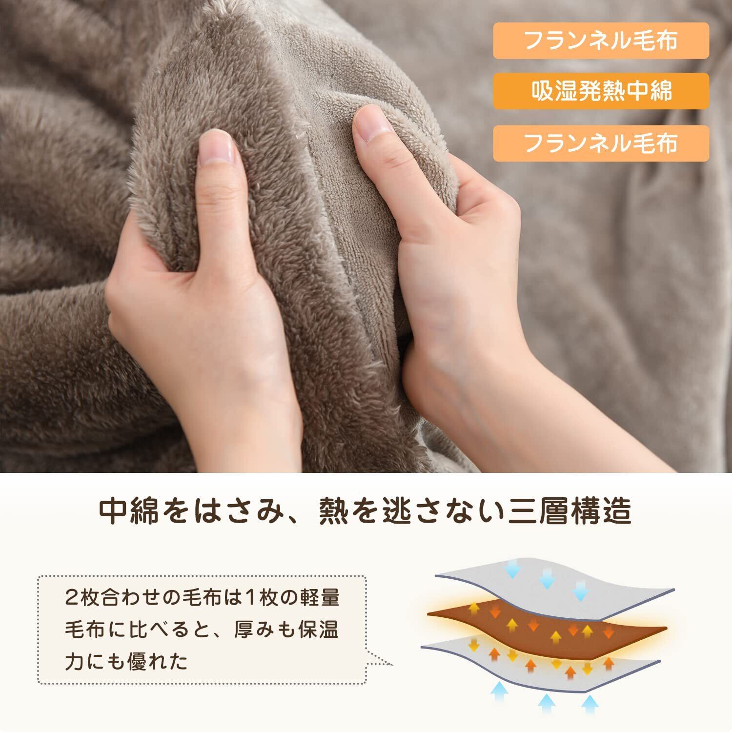 【2枚の毛布で中綿をはさむ、あったか三層構造】なめらかな肌触りのフランネル毛布で吸湿発熱中綿を挟んでいるので、1枚の毛布より抜群の温かさを実感できます。衿付きなので首元もふんわりあったか。布団の外から冷たい空気が入ってくるのを防いで中の温かい空気を逃さないです。