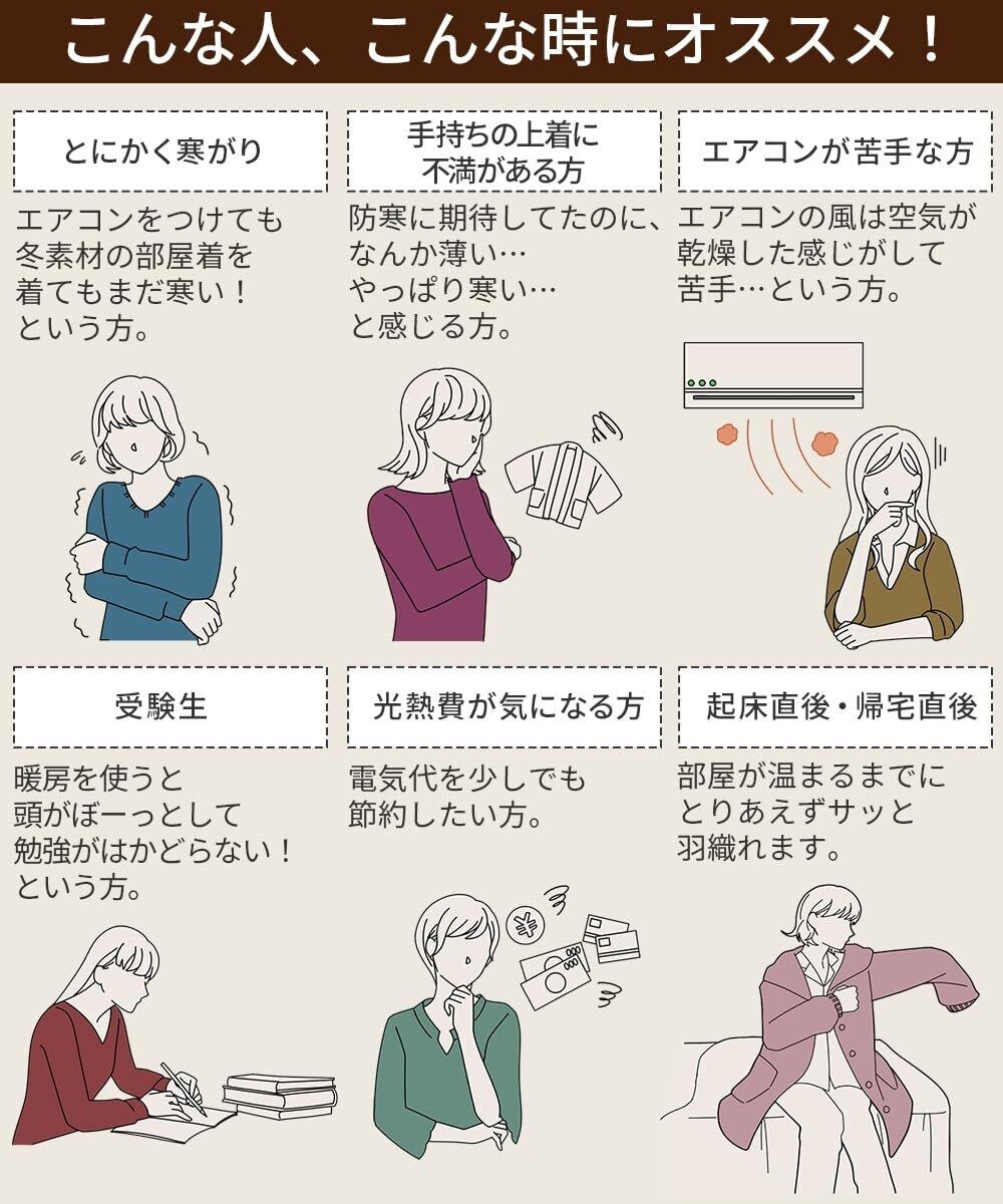 ■家事の邪魔にならない 袖口はゴム入り仕様。冷気をシャットアウトするだけでなく、お料理や洗い物、掃除などの家事をする際に腕まくりでき、袖を濡らさず便利です。 ■さっと羽織れる 前ボタン仕様で着脱は簡単です。朝起きたとき、帰宅時、お風呂上り、ちょっと寒い時にさっと羽織れてすぐあたたかです。