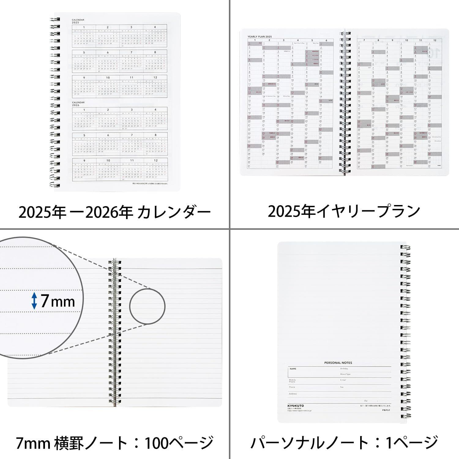 【内容】カレンダー1頁/イヤリープラン2頁/マンスリー32頁/ノート100頁/パーソナル1頁