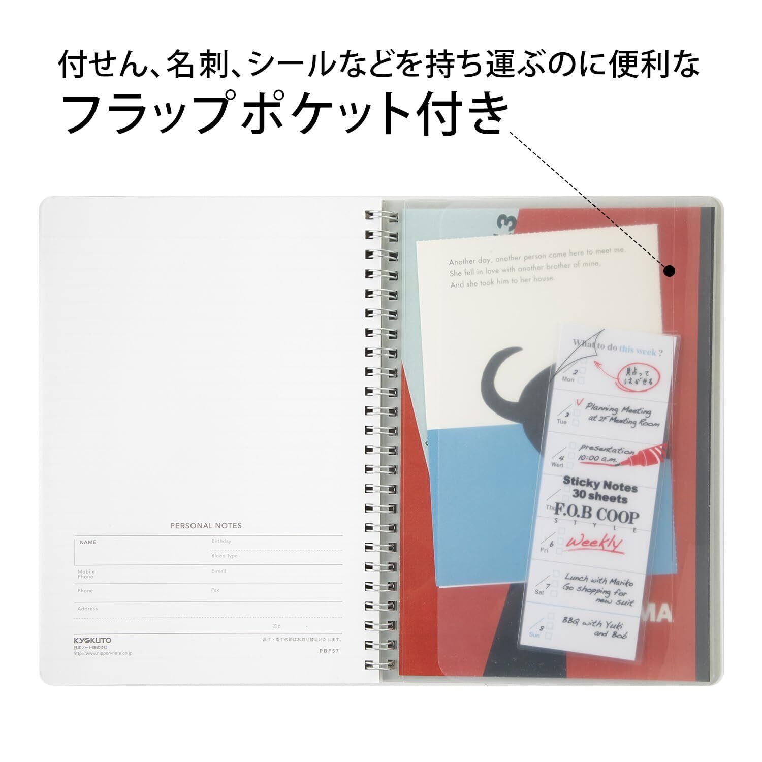 しっかりしたPP表紙に、製本はWリングタイプなので折り返しても使えて便利です。