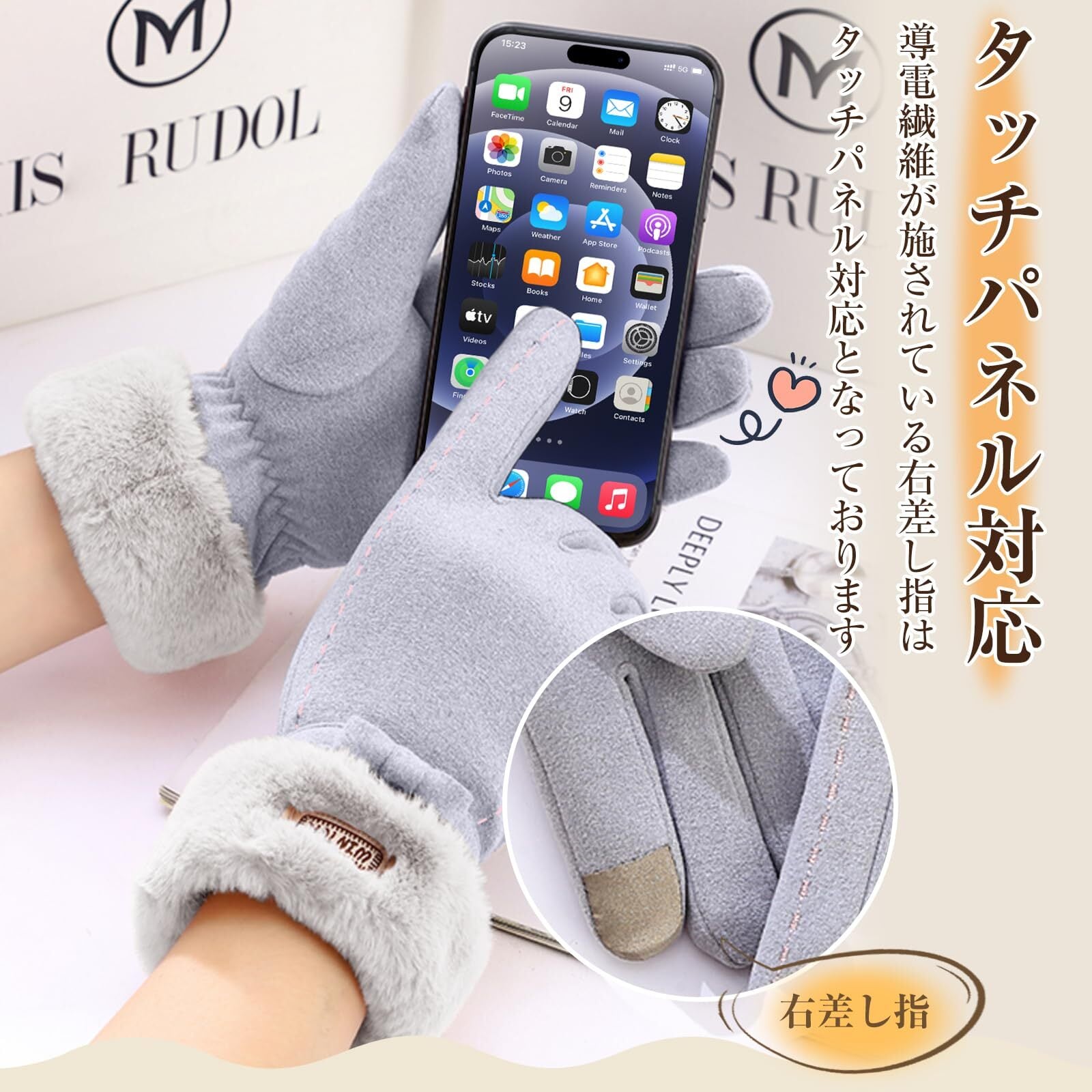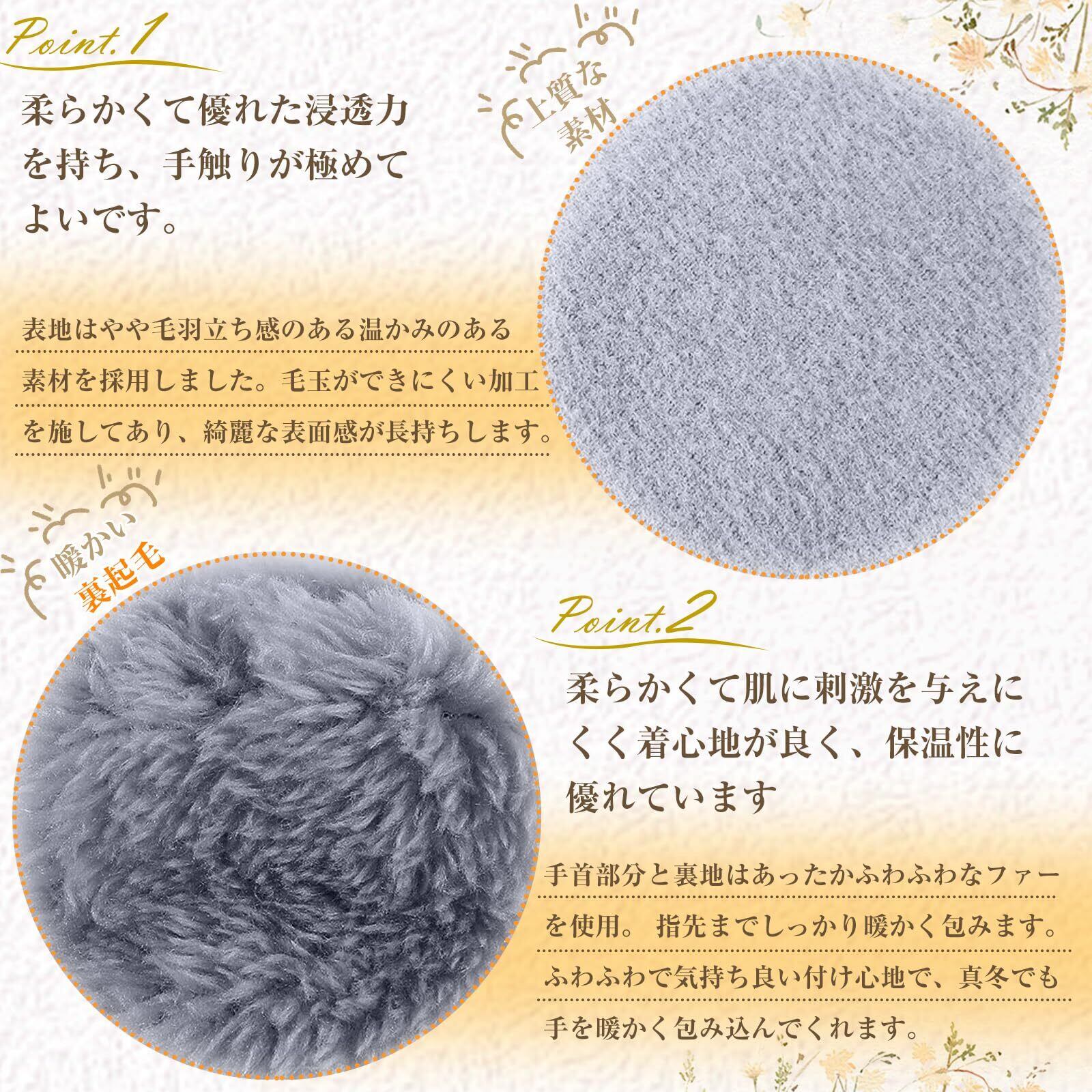 【指先までぽかぽか裏起毛】手首部分と裏地はあったかふわふわなファーを使用。 指先までしっかり暖かく包みます。ふわふわで気持ち良い付け心地で、真冬でも手を暖かく包み込んでくれます。お洗濯が可能です。ご自宅で手洗い、またはドライクリーニングをご利用ください。手洗いの際は、中性洗剤で押し洗いし、日陰で平干ししてください。
