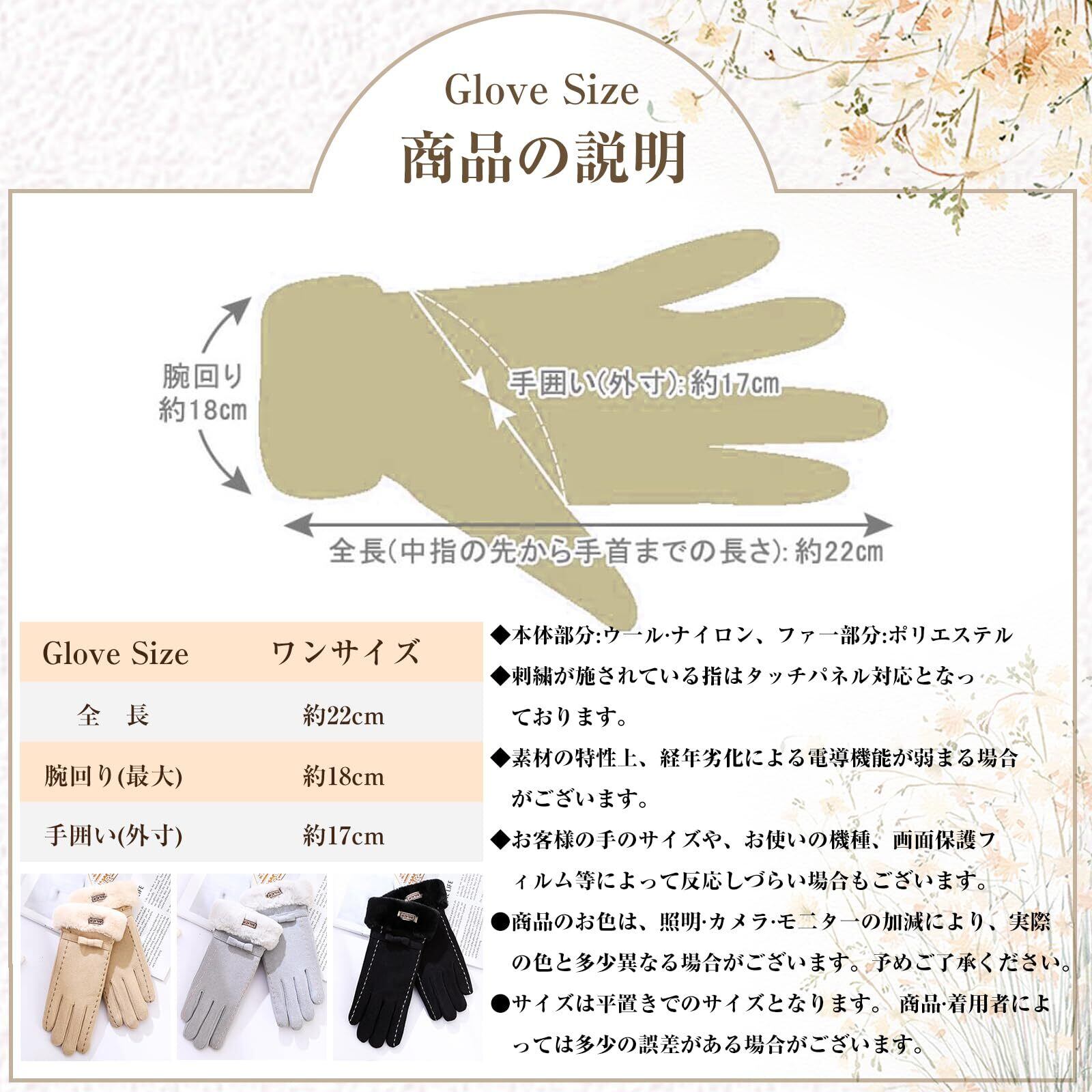 【超柔らかい肌触り】フリーサイズ:全長約22cm。中指長は約8cmです。重量:約72g。素材:超柔らかいウール・ナイロン(本体部分)、ポリエステル(ファー部分)。手の首がタグ付けた飾りのデザインです。表地はやや毛羽立ち感のある温かみのある素材を採用しました。毛玉ができにくい加工を施してあり、綺麗な表面感が長持ちします。●サイズは平置きで測定しております。商品・着用者によっては多少の誤差がある場合がございます。