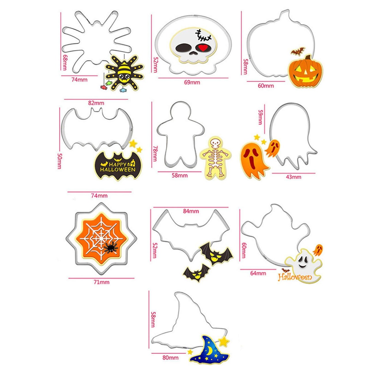 本セットには、カボチャやコウモリ、おばけ、クモ、帽子など、ハロウィンにぴったりのデザインが10種類!季節のイベントを盛り上げるために、お子様と一緒に楽しいお菓子作りを楽しめます。