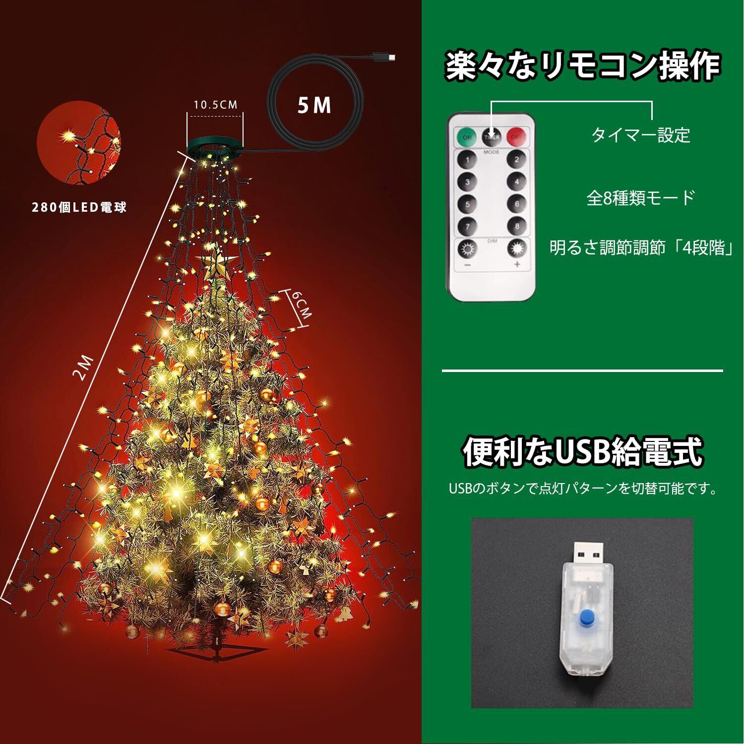 【クリスマスツリー飾りライト】クリスマスツリー飾り専門に設計のライトです。長さ:8本*2mの垂れ下がるワイヤライトで280個電球があります。カラフルの発光色で、ロマンチックな癒しの雰囲気を作り出します。本商品イルミネーションライトはUSB給電式で、普通のソーラー式ライトより輝度が高いく雰囲気を盛り上げます。ソーラー式の点灯時間と違い、曇りや雨、雪の日にもこの飾りライトはお必要に応じて一晩中、或いは毎日24時間点灯しても実現できます。