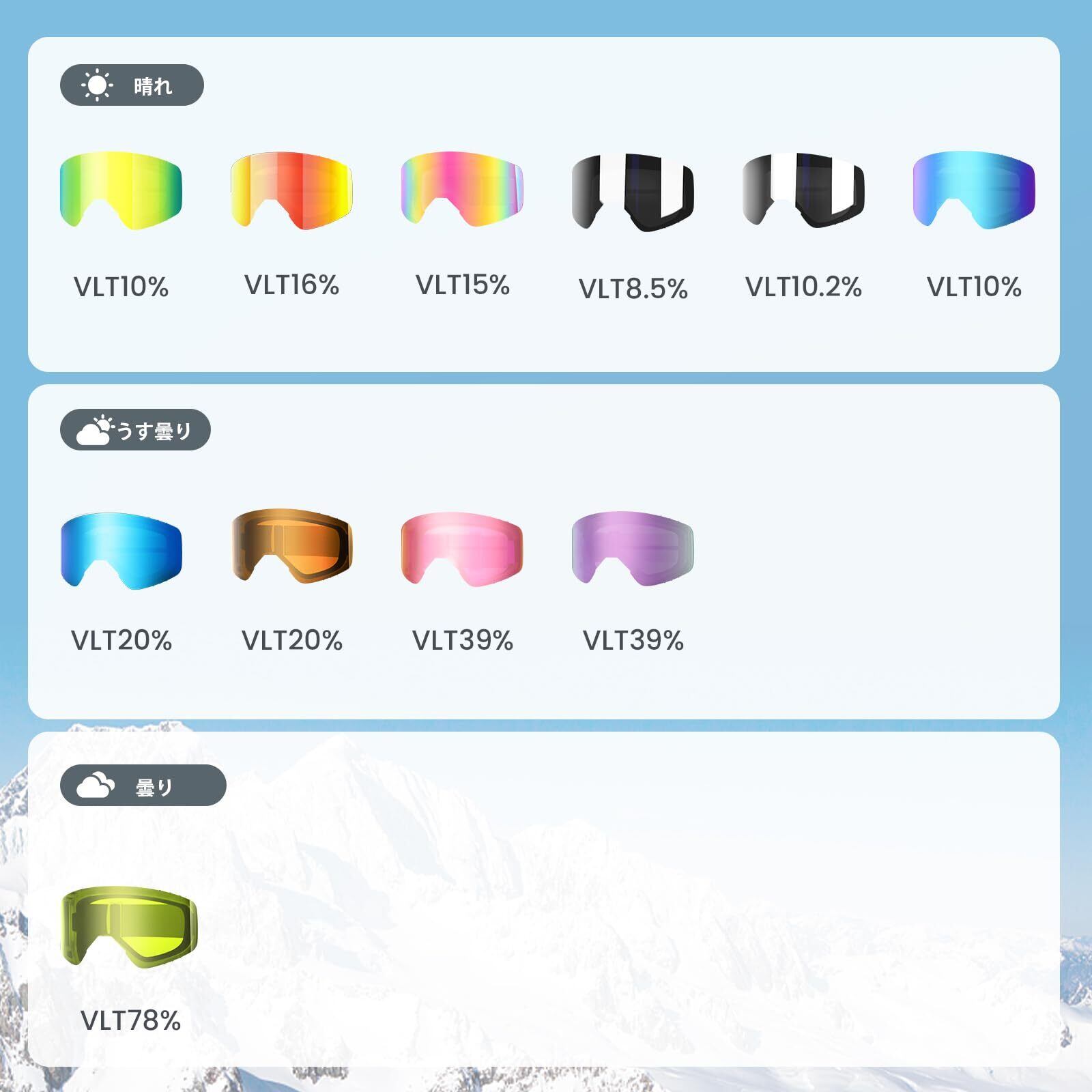 【OTG曇り止めダブルレンズモデル】Findway スキーゴーグル 大人は曇り止め効果の高いダブルレンズを採用、他の色と差を出すことでコントラストのはっきりした明るい視界で曇りの日でも暗くなく、晴れの日でも眩しくなく、ナイターや悪天候にも全天候対応します。レンズが二重構造で、外気とゴーグル内の温度差を小さくした曇りにくいです。紫外線(UV)を100%以上をカットし、ゲレンデの強い日差しや、雪面から反射する紫外線から眼を護ります。ゴーグル内部の空気容量アップとダブルレンズの効果でより曇りにくくなりました。レンズ間の隙間を少なくして光の屈折や視野の歪みを抑えています。レンズが大きくて、視界も広くかなりクリアーで上下左右の視野も広く確保しています。視界が暗くなるのが苦手なゴーグル初心者にオススメします。
