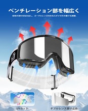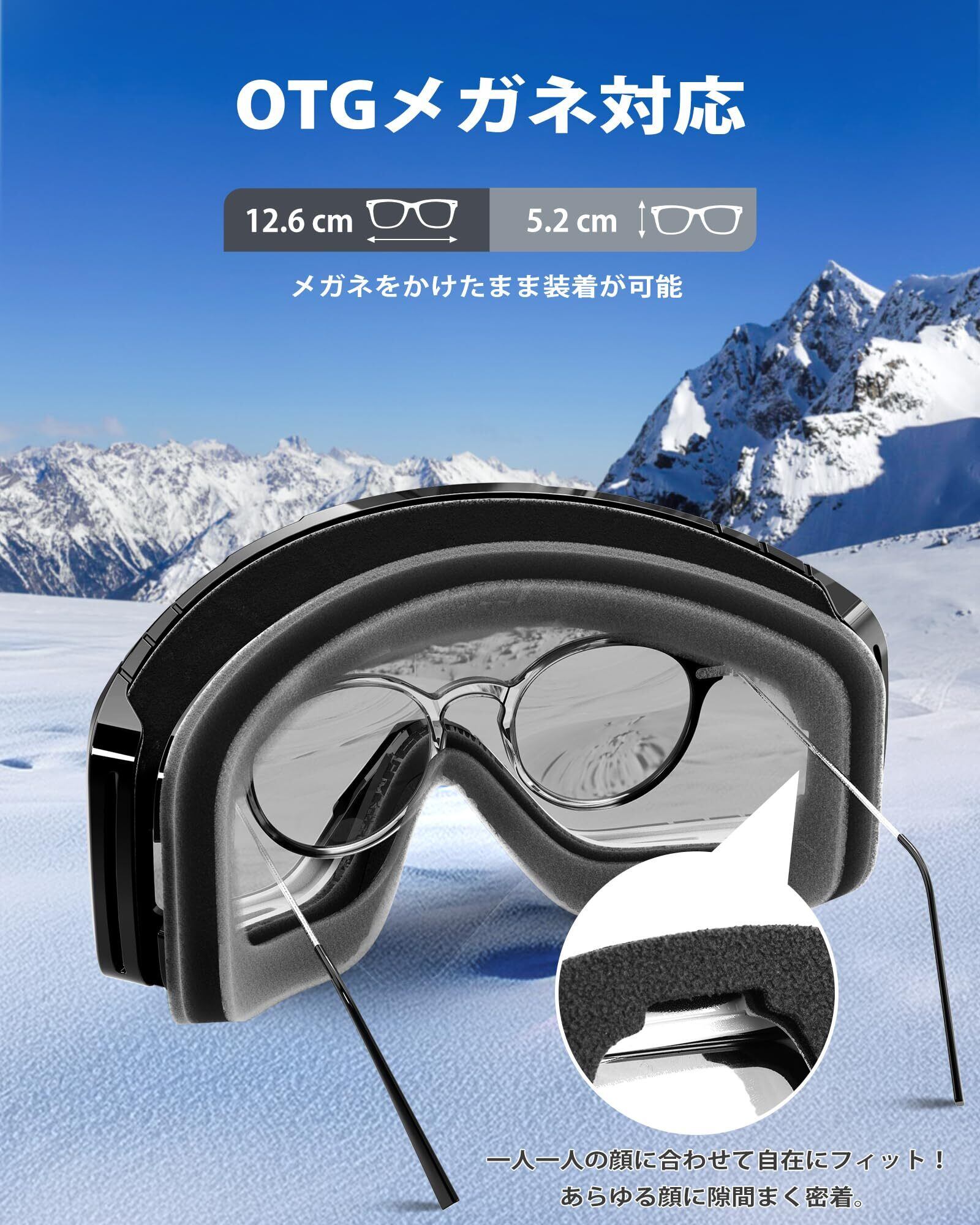 【メガネをかけたまま装着が可能】キーゴーグル 大人は柔らかいフレーム設計とOTGで眼鏡のまま使用できます。ゴーゲル内に奥行きを持たせる設計によりメガネの上から装着が可能です。メガネの上からつけ外ししてもメガネが引っ張られなくて快適です。ベンチレーション部を幅広く設けることにより空気の流れを生み出し、ゴーグルレンズのみならずメガネの曇りも制御します。サングラスより大きいので顔が大きい方でも装着しやすいです。眼鏡利用の方も十分におすすめできるスキーゴーグル 眼鏡対応です!眼鏡をかけてもできるサイズで左右12.6cm・高さ5.2cmの大型メガネまでとの組み合わせは最高です。ゴーグルに納まり、圧迫感のない快適なフィット感を得ることができます。ぜひFindway スキーゴーグル試してみてください。