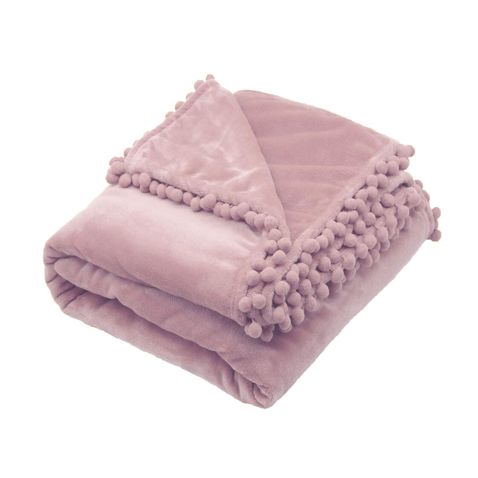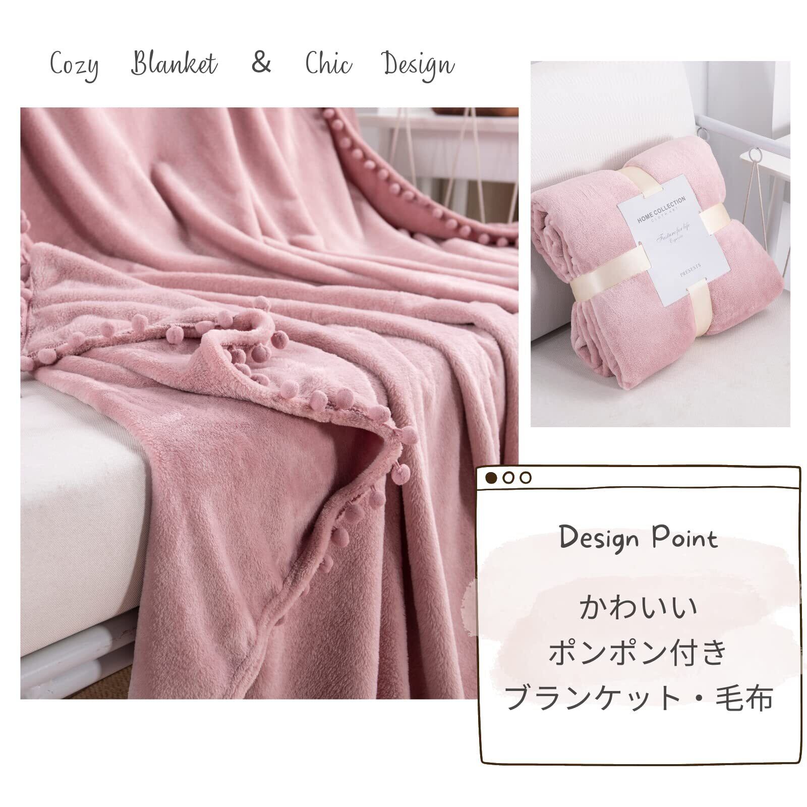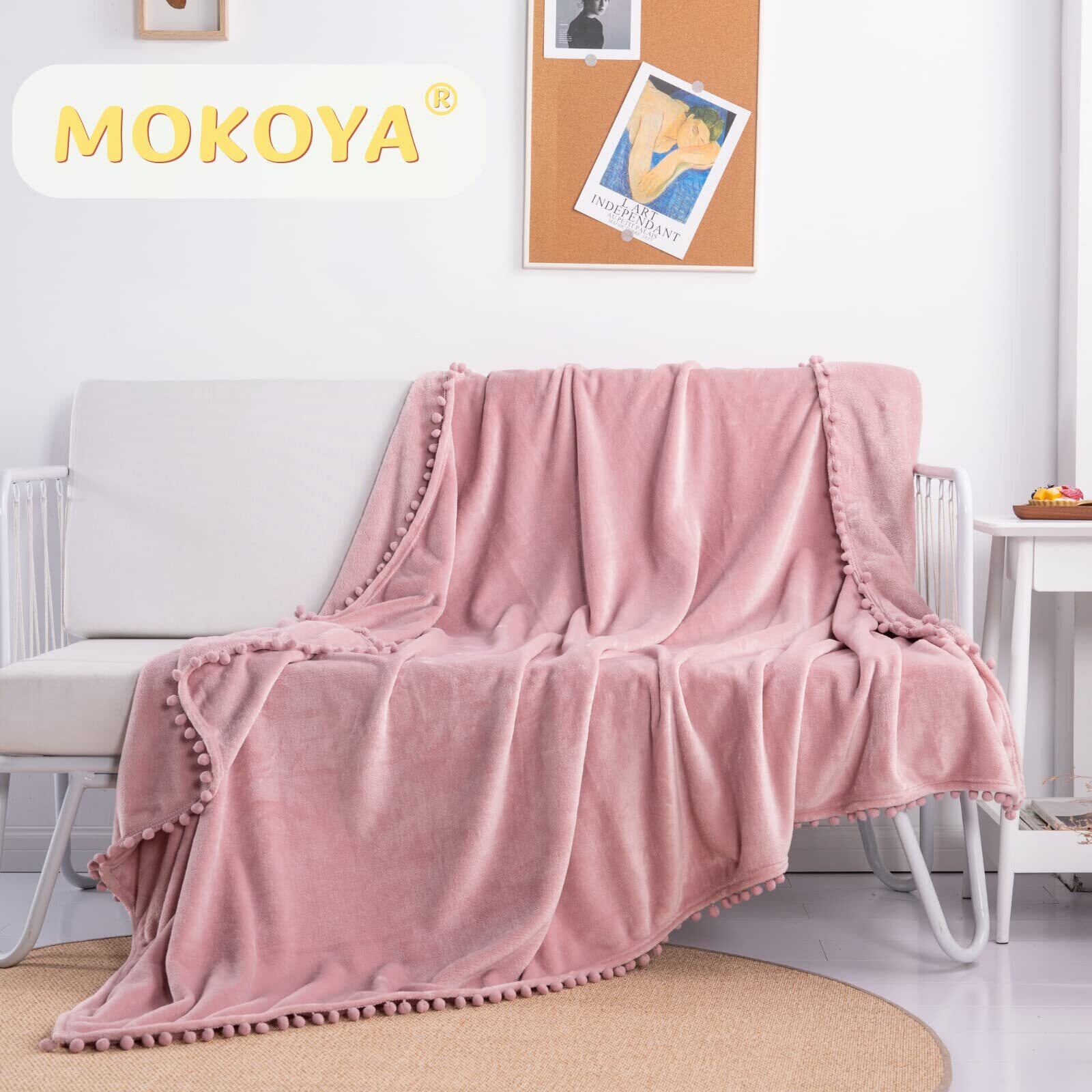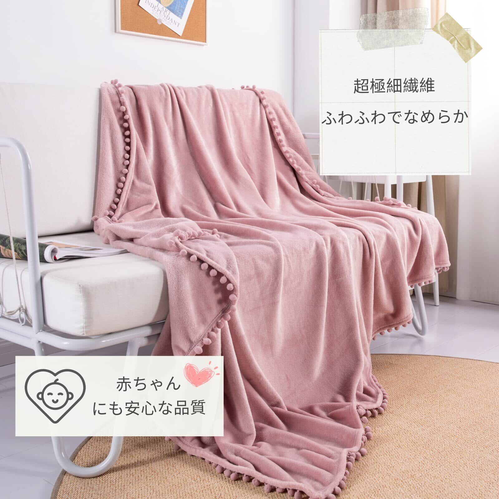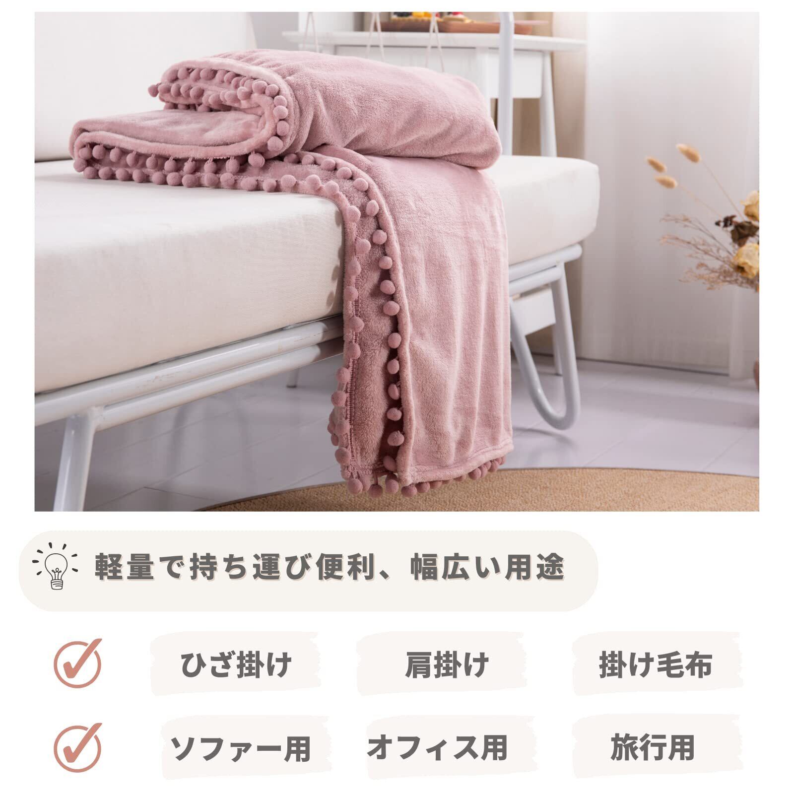Mokoya 毛布 シングル 可愛い ブランケット 130x160cm 膝掛け 大判 おしゃれポンポン付き ふわふわ柔らかい 多用途 肩掛け 軽量 洗える 通年使用 (ピンク)