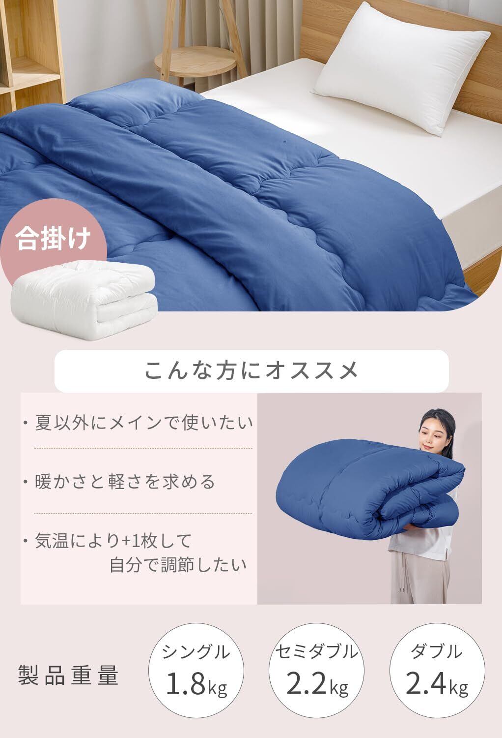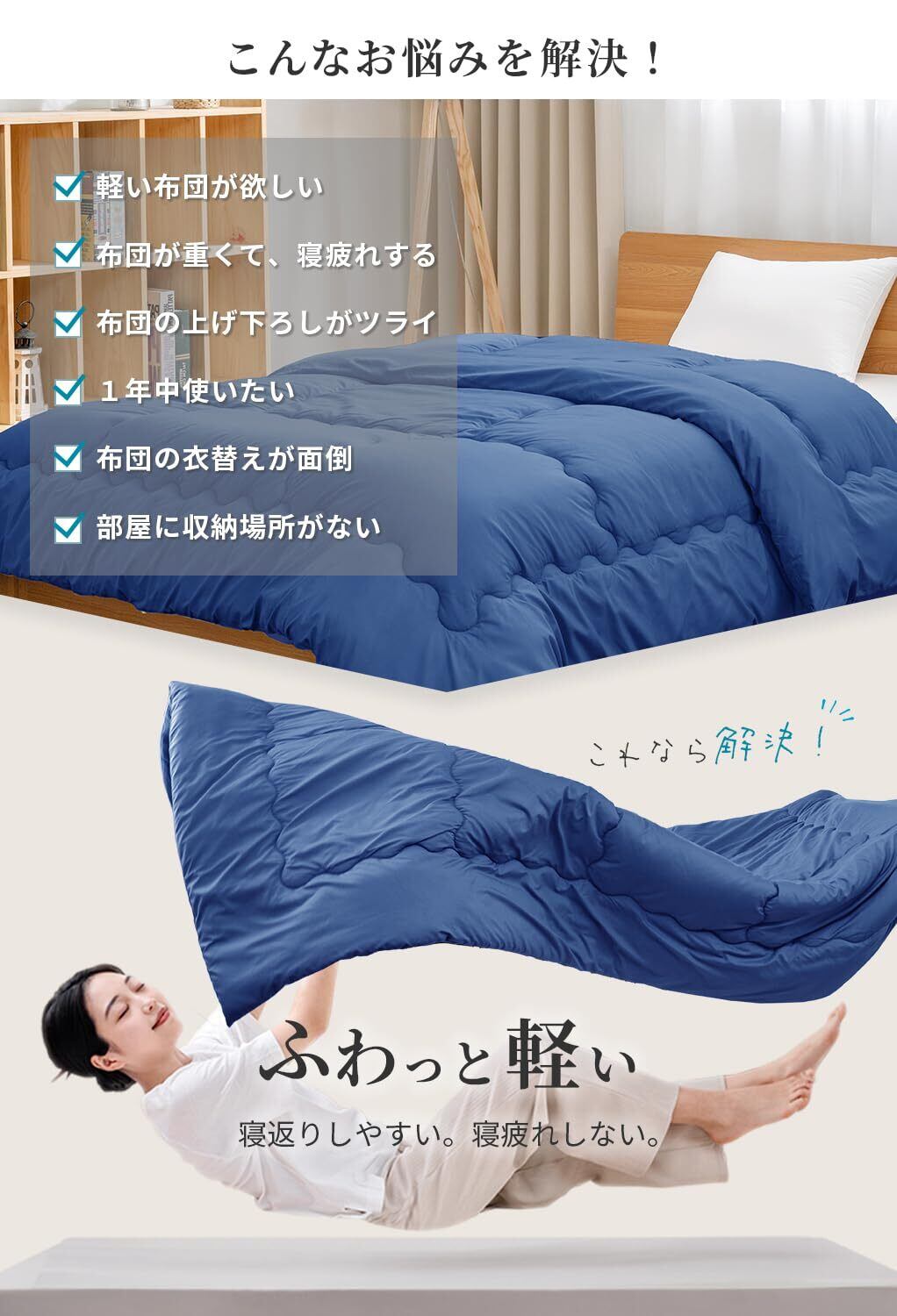 【フワっと軽い!】フワっと軽く体を包んでくれるので、よりリラックスした眠りに。女性でも持ち運びラクラク!来客用にもピッタリです。