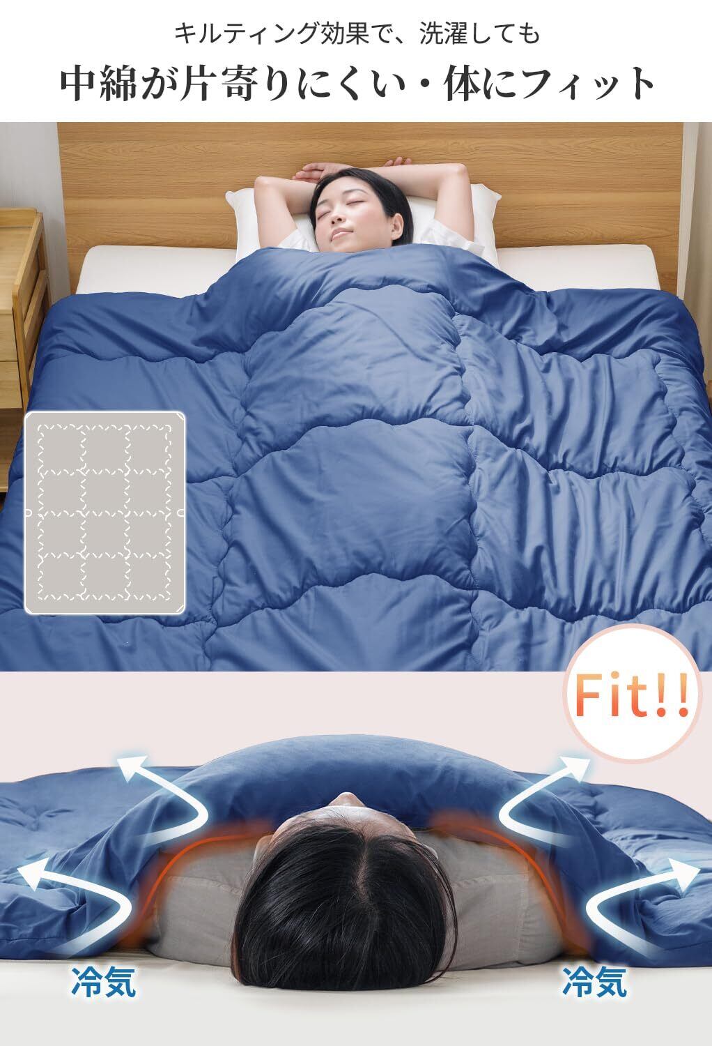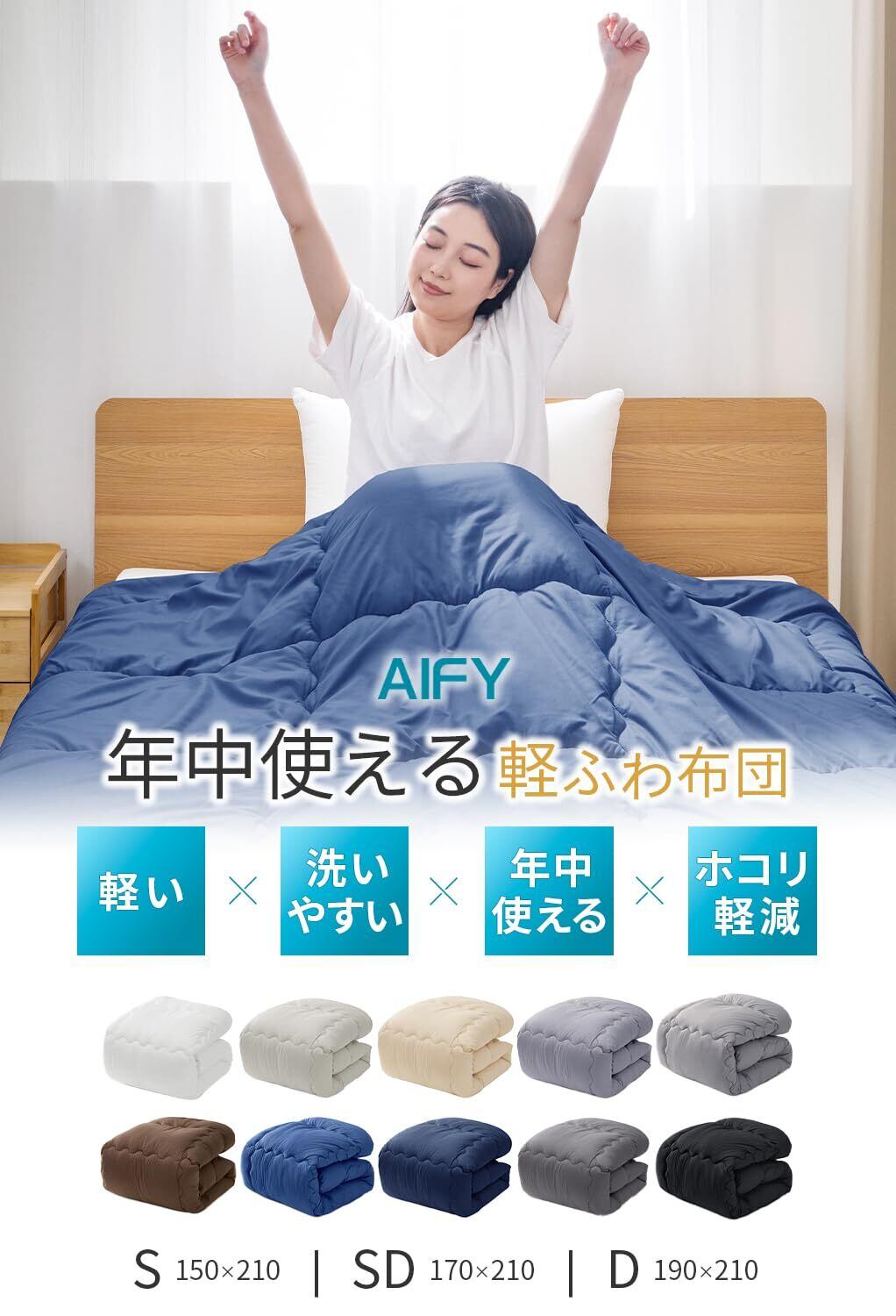 AIFY 掛け布団 シングル 150×210cm 【合掛け・オールシーズン】 洗える 秋冬 軽量 抗菌 防ダニ 通気 【SEK認証】ダークブルー (約1.8KG)