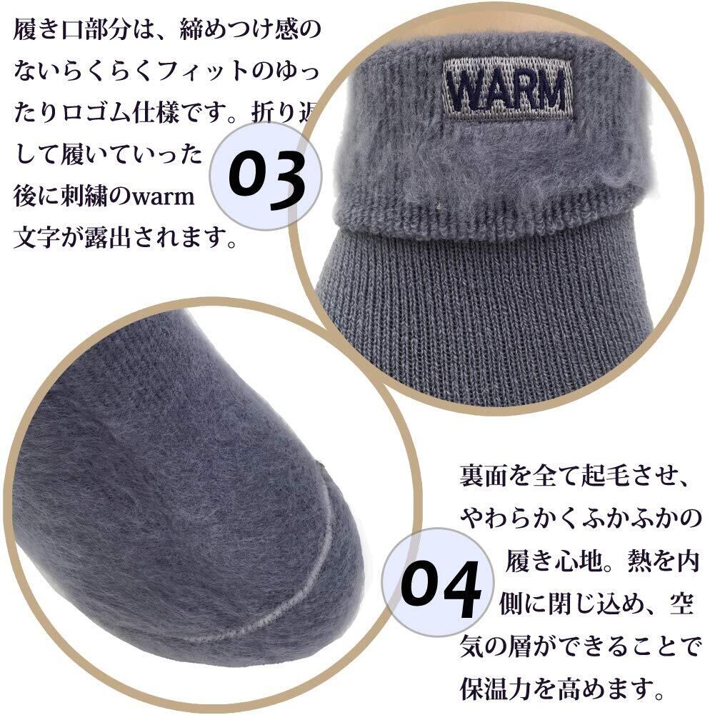 4.表地はコットン素材、裏地はモコモコの断熱繊維でやわらかく非常に暖かい履き心地のルームソックス。熱を内側に閉じ込め、空気の層ができることで保温力を高めます。寒い中でアウトドアに長時間いる時もこれがあれば安心。履き口部分は、締めつけ感のないらくらくフィットのゆったりロゴム仕樣です。折り返して履いていった後に刺繍のwarm文字が露出されます。暖かっぽくも可愛らしくもコーディネートが楽しめます!様々雑誌でも掲載されて、今年も大人気!