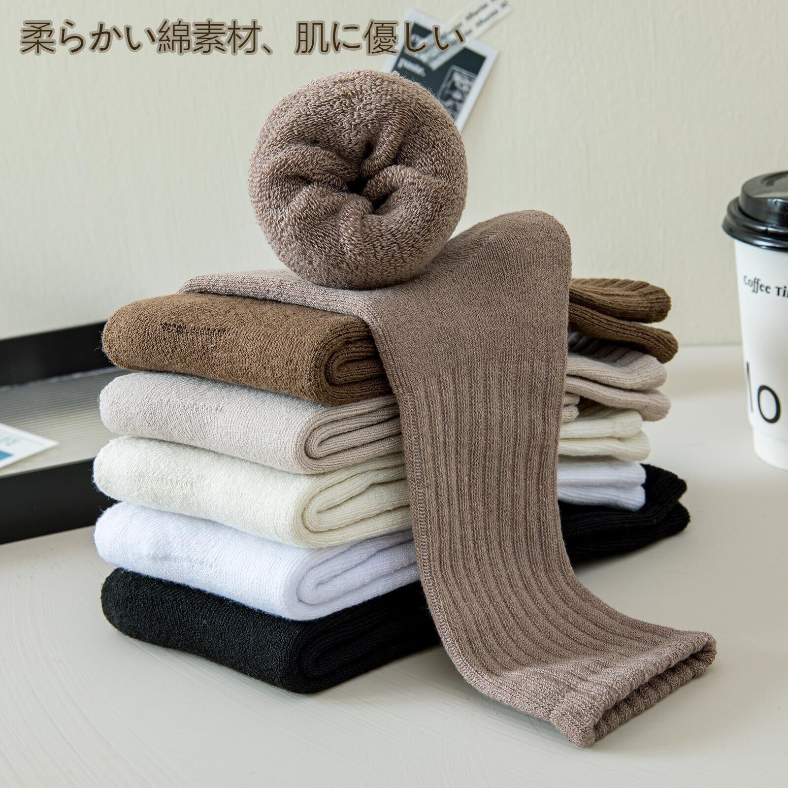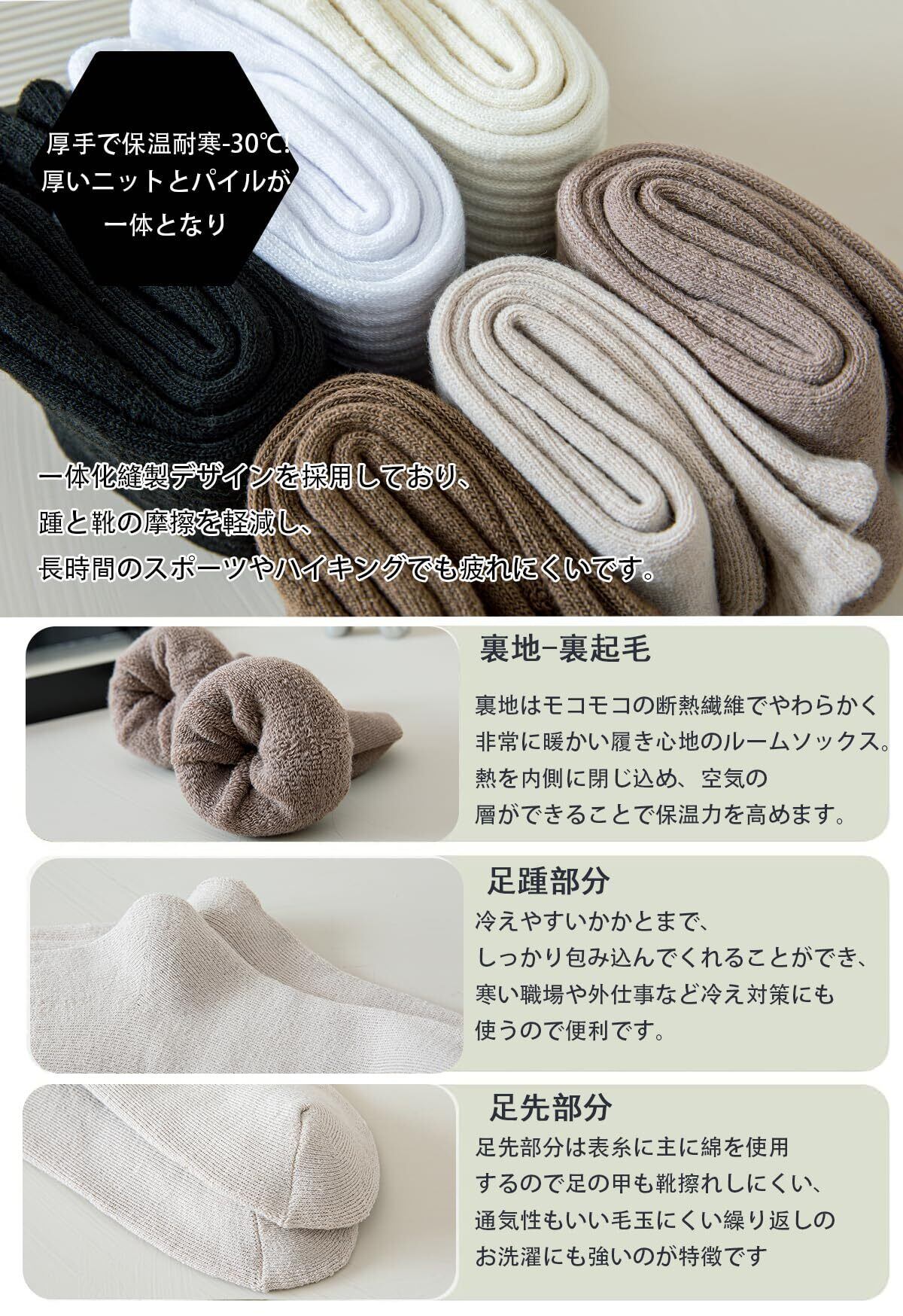 快適な着用感:高品質な綿素材を使用し、ソックスが柔らかく肌に優しい。伸縮性が高く、締め付け感がなく、快適な履き心地。
