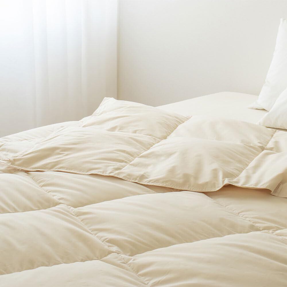 羽毛肌掛けふとんは羽毛の量とキルトを調整しています。軽く、適度な保温力、吸湿発散性があり、夏の間には1枚使いでダオルケットのように。寒い季節にはお手持ちの寝具に1枚プラスしてよりあたたかく、1年中便利にお使いいただけます。別売りの合い掛けふとんと一緒にループへ取り付けることで簡易的に2枚合わせ(冬用 デュエット)にできる外付けのボタン付きテープをお付けします。サイズとループの位置が肌掛けと同じならば既にお持ちの布団にも取り付けられます。