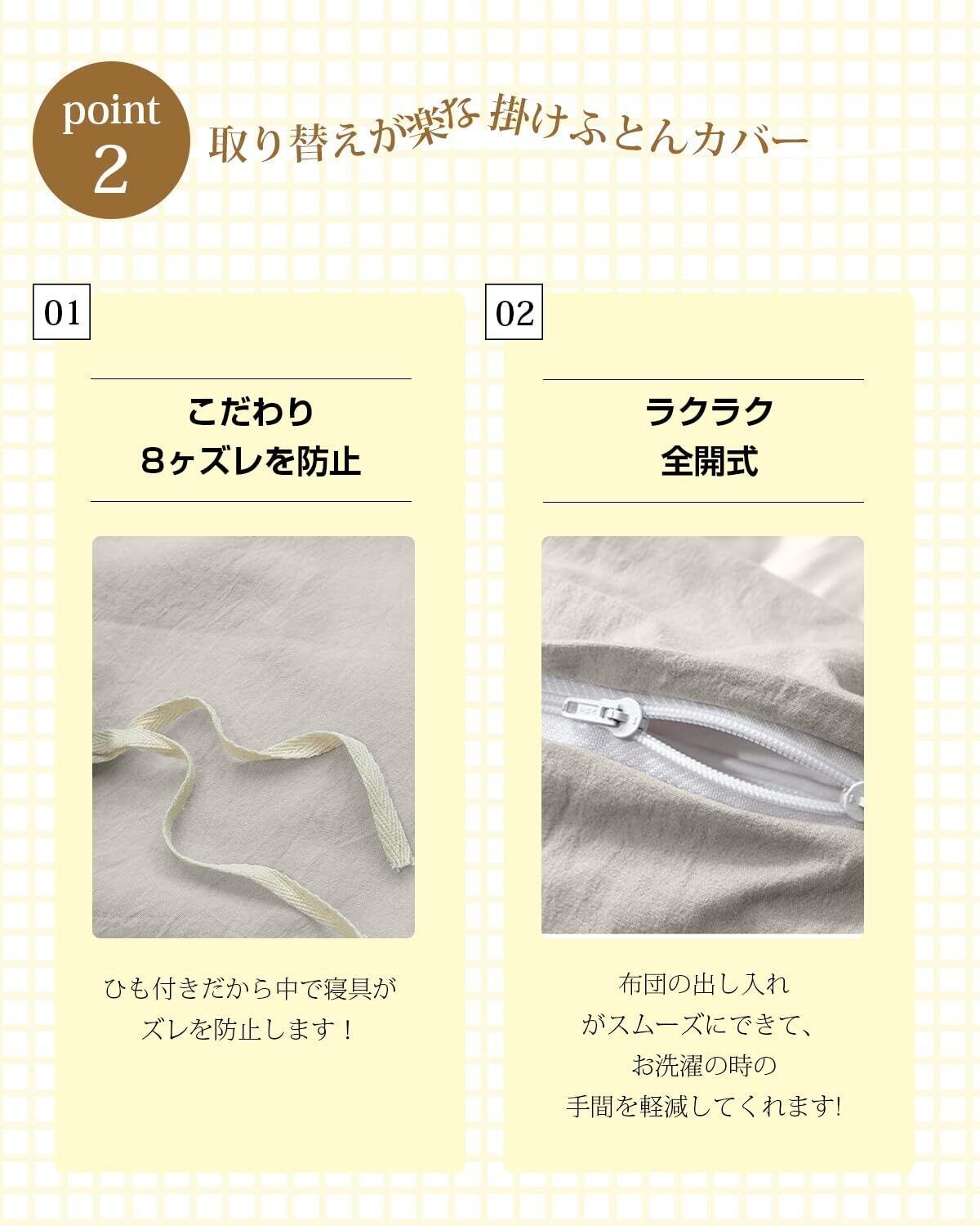 「全開·両開きファスナー式」ファスナーは取手が2つついたダプルスライダータイプのため、掛け布団の着脱もスムーズです。それに、どのサイズもズレ防止用の紐がそれそれ8箇所(4隅、4边の中央)についています。布団とカバーをしっかり固定できて、寝具がズレることなく快適に使える。