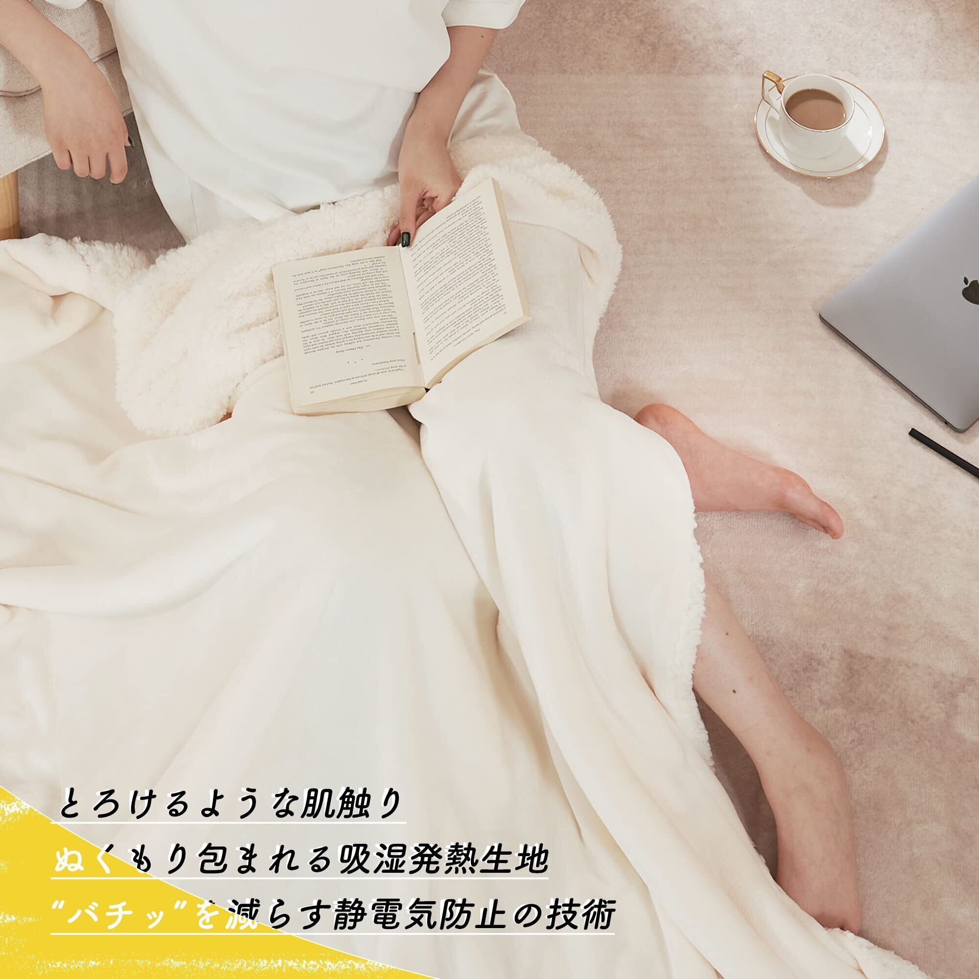 230x230cmの大判サイズで、ダブルベッドにも十分対応。毛布は両面使用可能で、ふんわりしたマイクロファイバー素材は柔らかく、触れた瞬間から快適さを実感できます。冷房の効いた部屋でも、温かさを感じることができます。