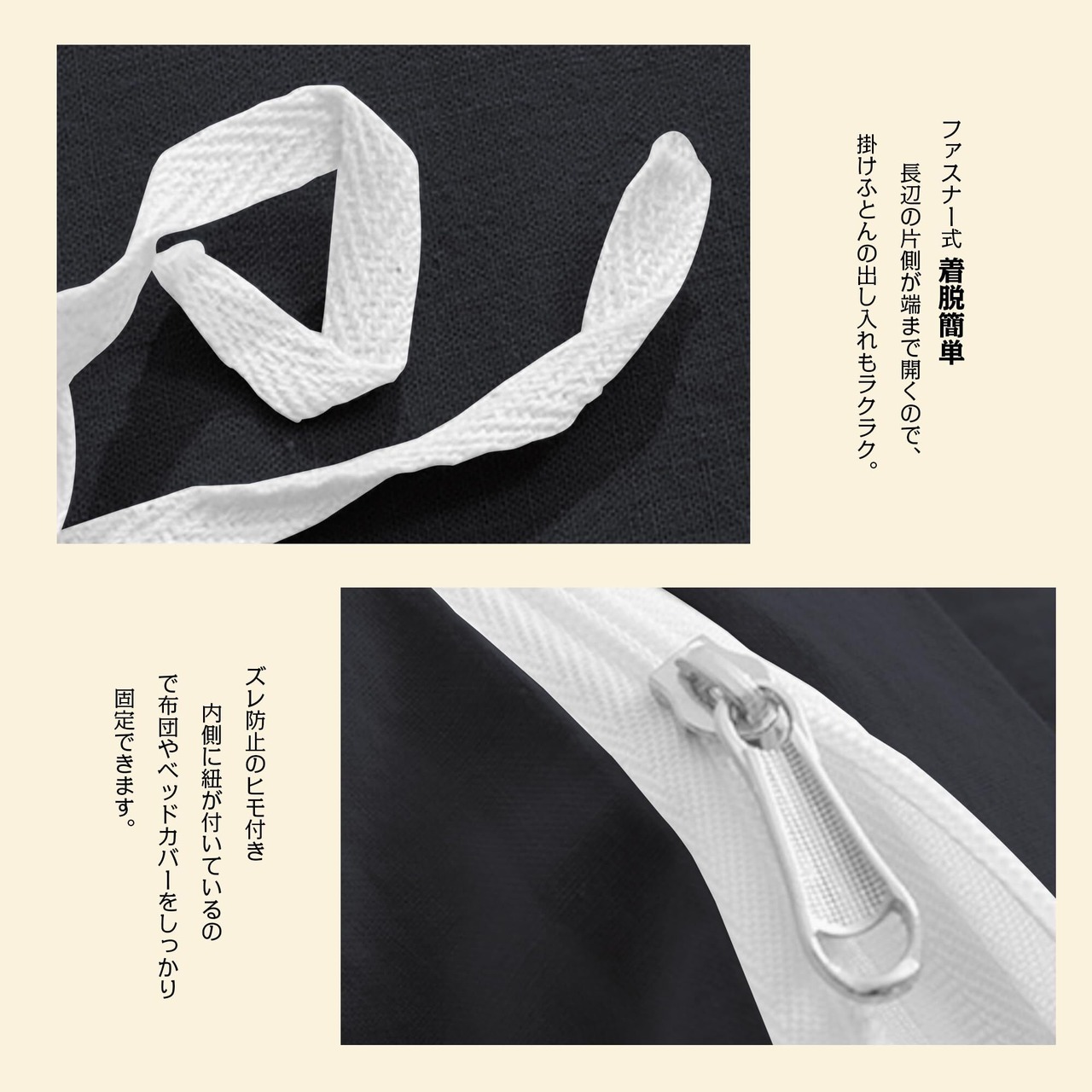 【全開ファスナー 取り付けラクラク】この布団カバーは使いやすさを追求した設計で、カバーの片側には全開ファスナーがあり、8ヶ所の紐で布団を固定できます。ぐーんと大きく開くので大変なふとんの出し入れがスムーズにできます。お手入れも簡単なので、忙しい主婦の強い味方です。一人暮らしの方や衣類のお手入れが難しい方におすすめです。